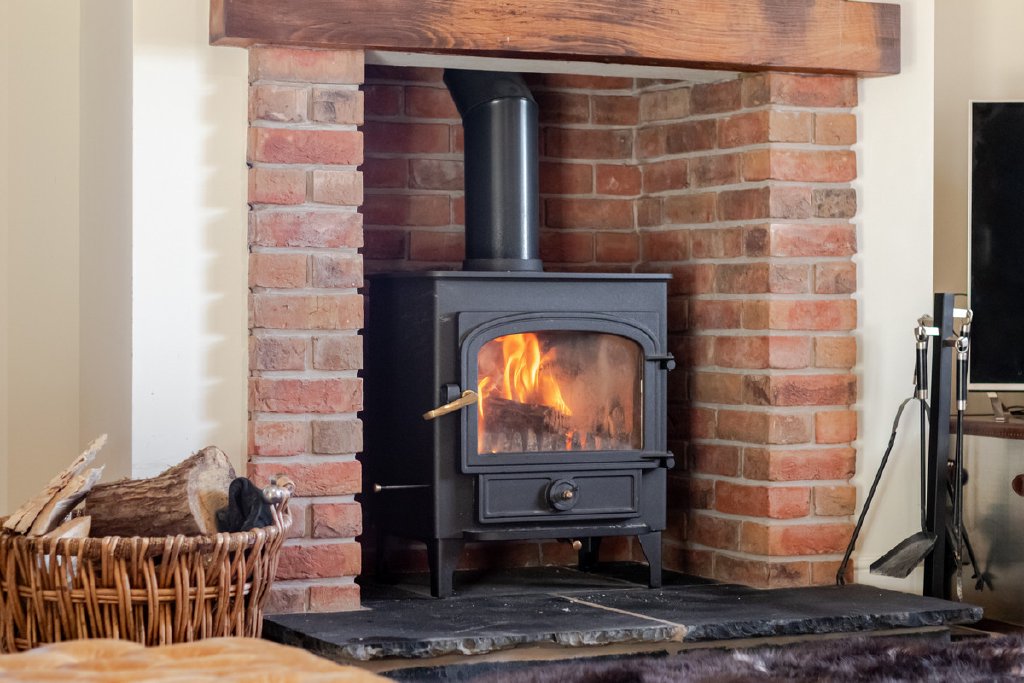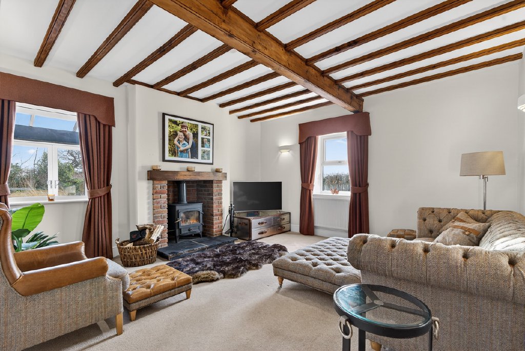 The living and dining rooms are generously proportioned, each featuring a feature fireplace with a wood-burning stove, creating inviting focal points and warm, comfortable spaces for family and guests. Adjacent to the dining room, a stunning orangery floods the interior with natural light and benefits from two sets of double doors opening onto the patio, seamlessly connecting indoor and outdoor entertaining areas.