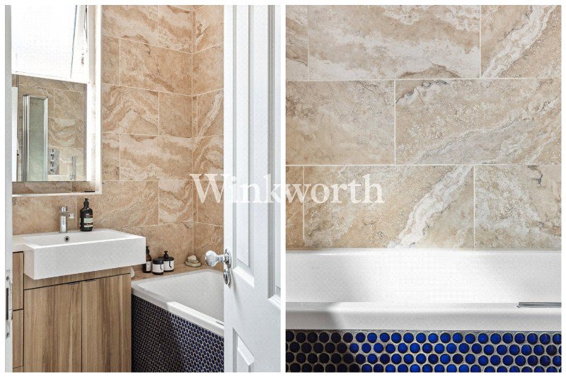 Upstairs, three double bedrooms continue to impress, each finished to a high standard, and all fitted with top quality pure wool carpets. The front bedroom is supplied with custom-made hand painted wooden blinds while the back bedroom features bespoke fitted storage. The luxurious family bathroom is fitted with quality fixtures, Victorian glazed blue tiles, and underfloor heating.