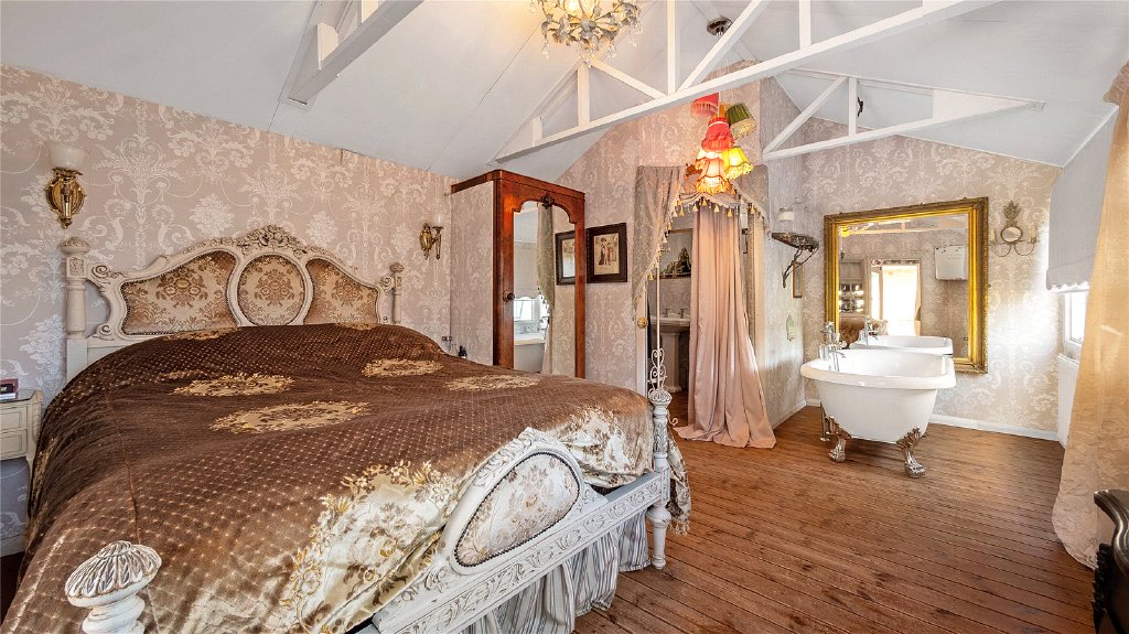 The property offers three double bedrooms and a cozy snug room, each thoughtfully designed. The master bedroom is a luxurious haven, complete with built-in wardrobes and an elegant ensuite bathroom featuring a freestanding bath and double sink. Natural light fills the space, spilling in through the skylight.