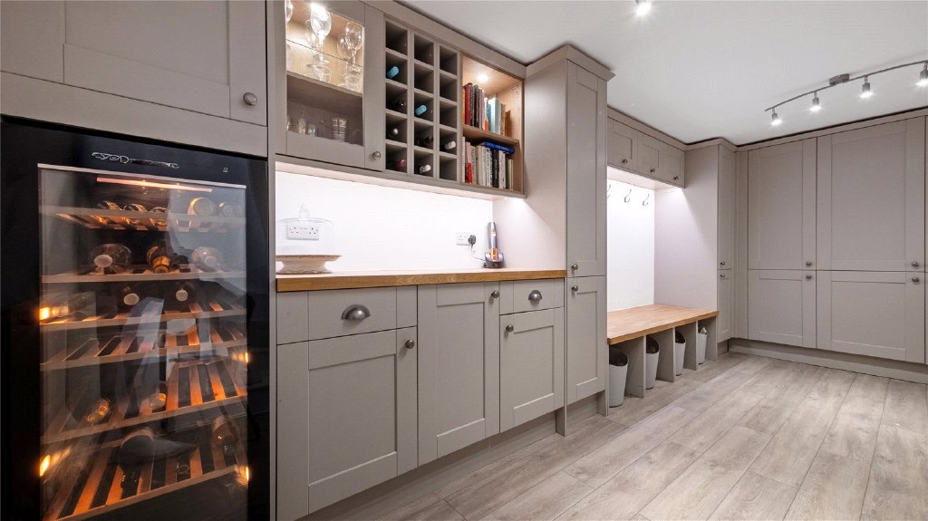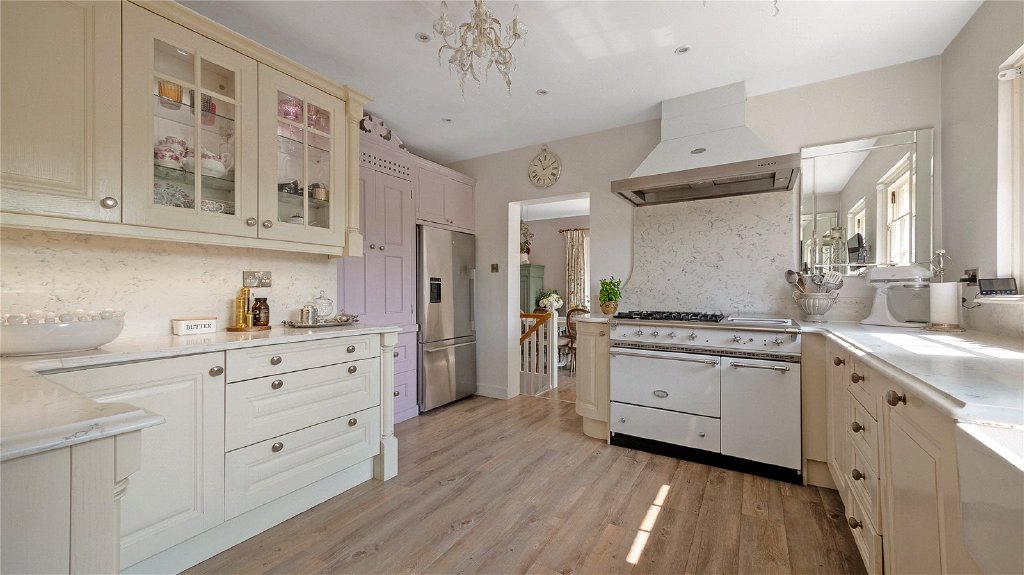 The kitchen is a masterpiece of design and functionality, featuring quartz worktops, a butler sink overlooking the garden and a premium Lacanche cooker equipped with a plancha, electric oven, warming drawer, large gas oven and extractor hood. The built-in larder unit and ample hidden storage, including concealed bin drawers, ensure both style and practicality.
