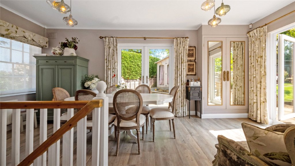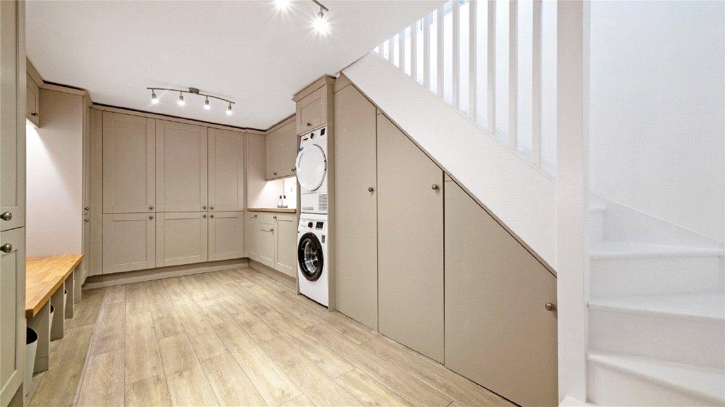 Adjacent to the kitchen is the formal dining room, a bright and airy space with two sets of double doors opening onto the garden, creating a seamless indoor-outdoor flow. Stairs from this room lead to a newly refurbished basement utility room, which boasts floor-to-ceiling fitted cabinets, a wine fridge, and plenty of space for laundry appliances. This versatile space could also serve as a home cinema.