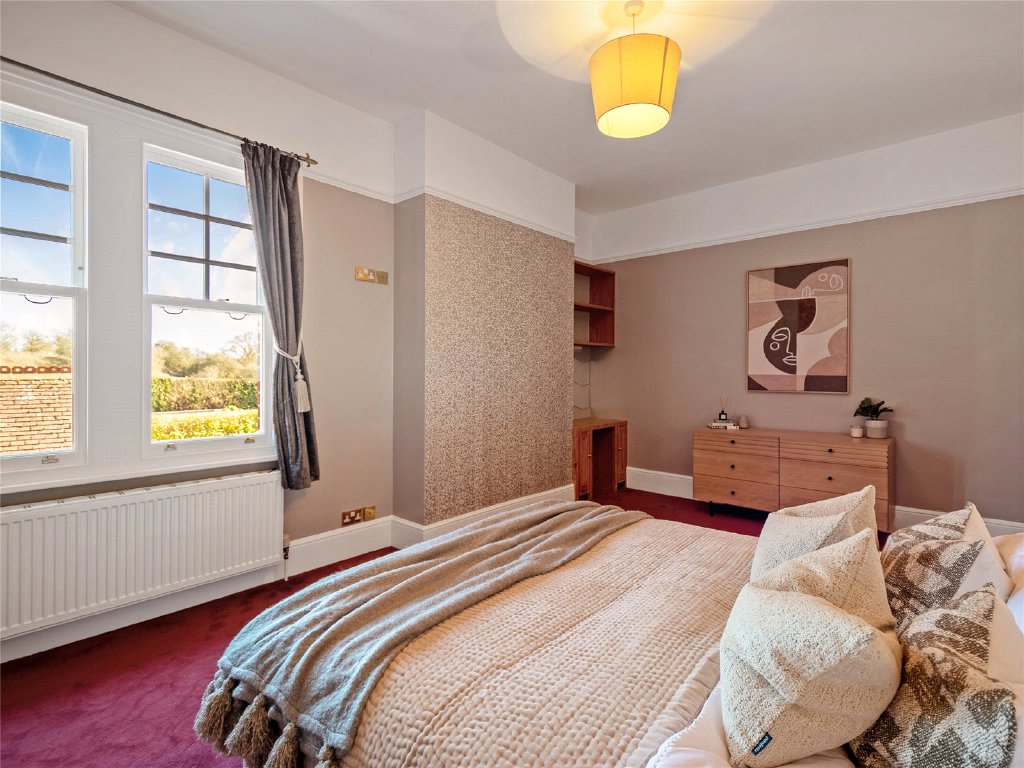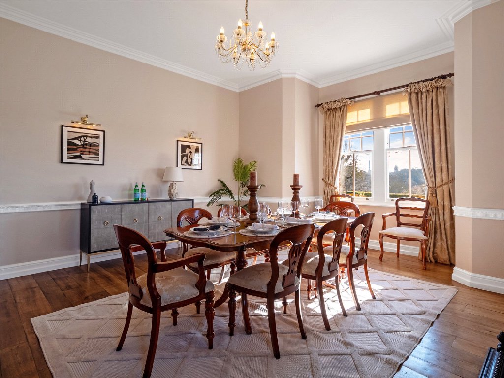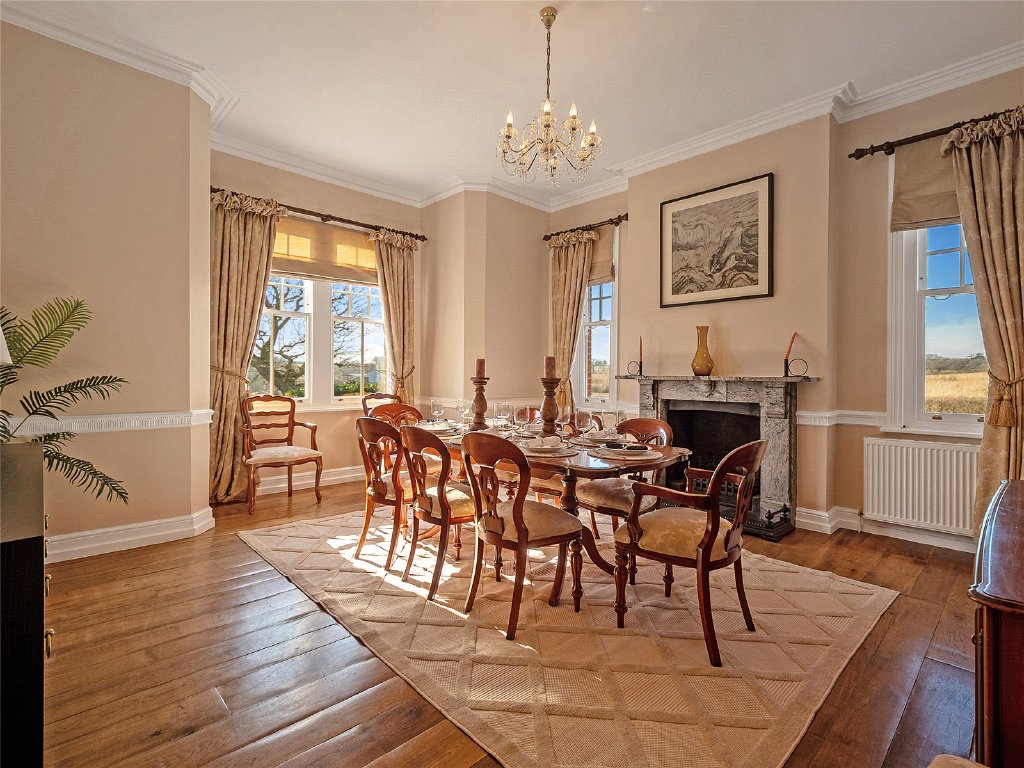 As you enter the property, you are greeted by an impressive entrance hall with high ceilings, showcasing the beautiful wooden main staircase. At the front of the property, the formal dining room is perfect for hosting family gatherings. The cosy yet spacious sitting room also enjoys stunning views out onto the landscaped gardens, and double doors opening onto the terrace. This home is filled with natural light, spilling in through the beautiful large windows.