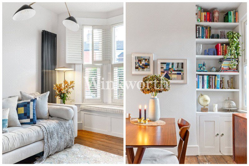 The ground floor is a standout. The double reception has stripped and restored wood floors, bespoke storage, plantation shutters and a striking feature fireplace with a working wood burning stove.