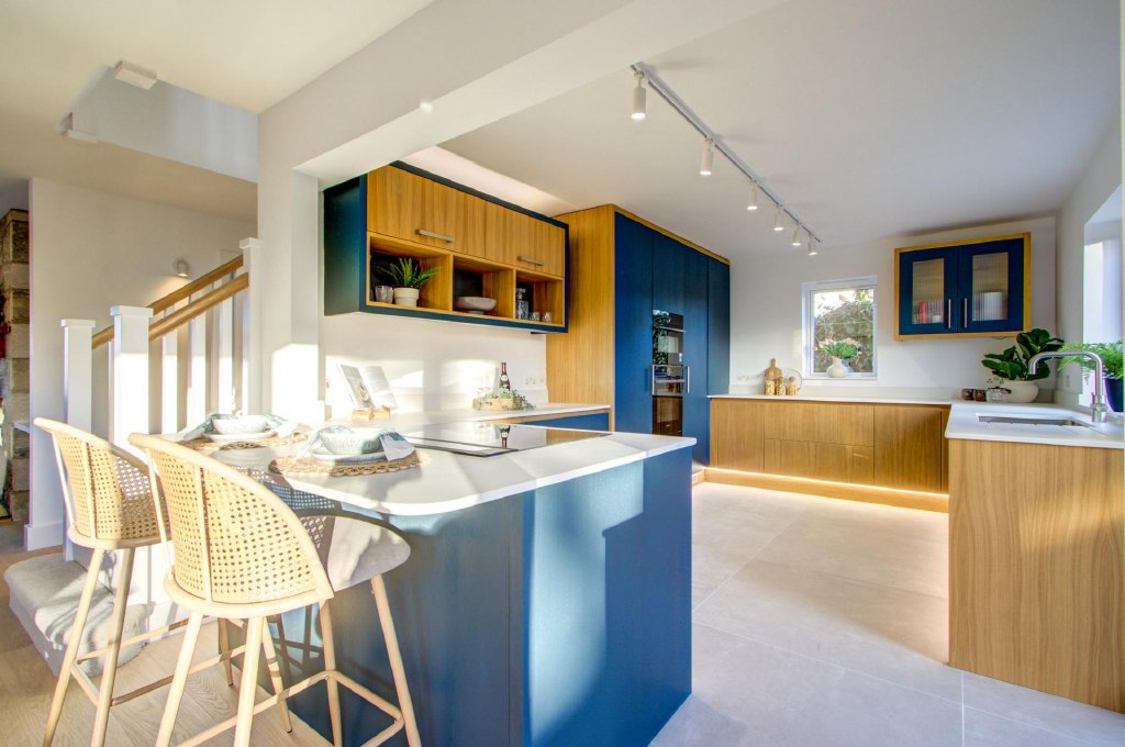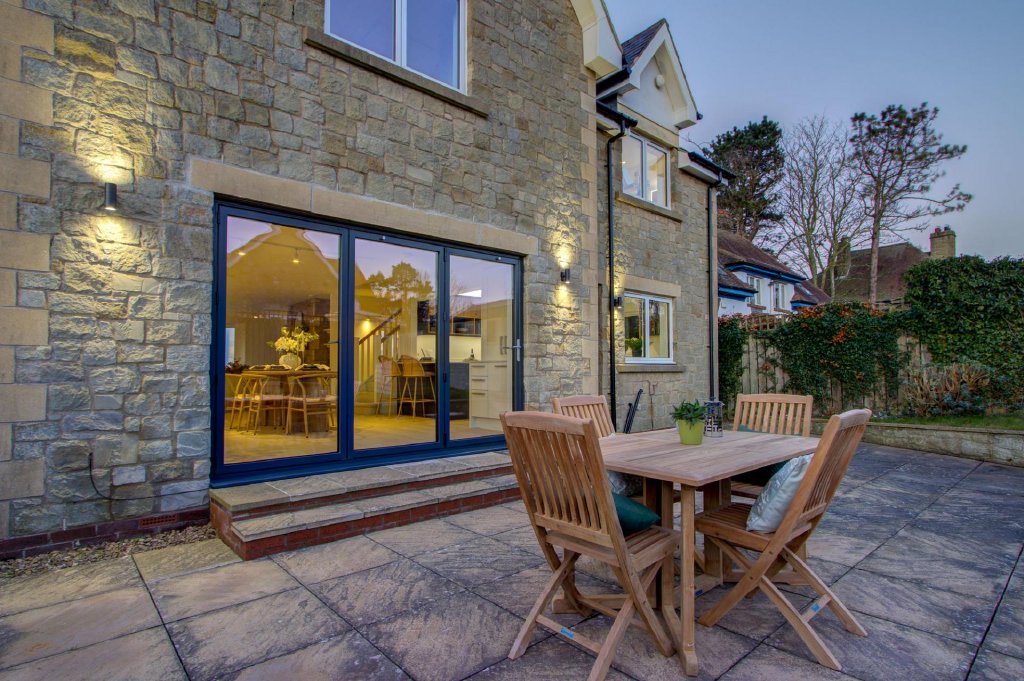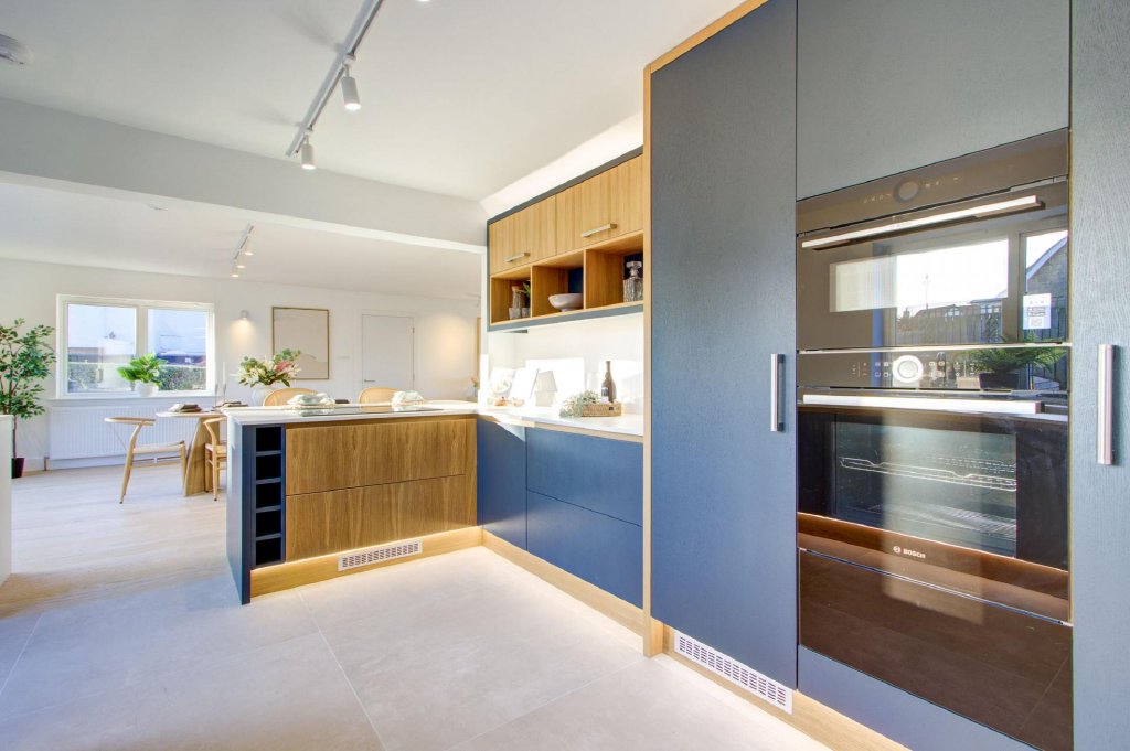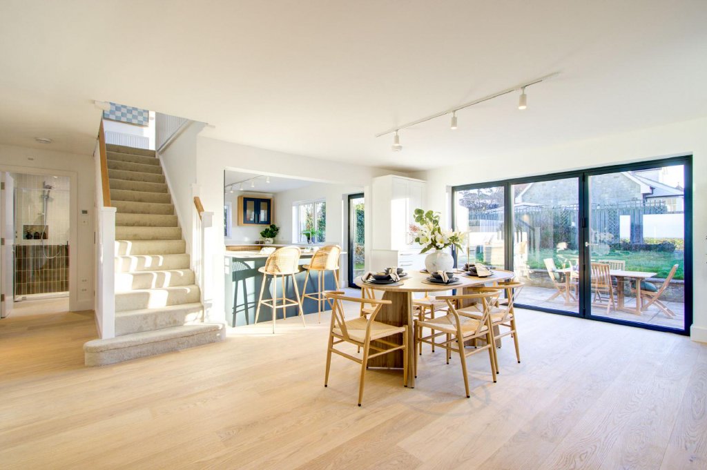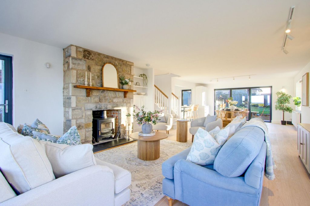 At the heart of the home is the fabulous open plan living, kitchen and dining space. Flooded with natural light and designed for modern living, this is a room made for entertaining, relaxing and enjoying the spectacular coastal views. The kitchen is fitted with high-specification appliances and quality cabinetry, providing a sleek yet practical space. The dining area, with ample room for a large table, is ideal for leisurely meals with the family or entertaining friends on a grander scale. Bifold doors open directly onto the rear garden, allowing the light to flood in and creating a seamless connection between indoor and outdoor living. The relaxing sitting area centres around a striking stone fireplace with a wood-burning stove. A large bay window frames the stunning sea views, creating a calm and atmospheric room that is perfect for all seasons.