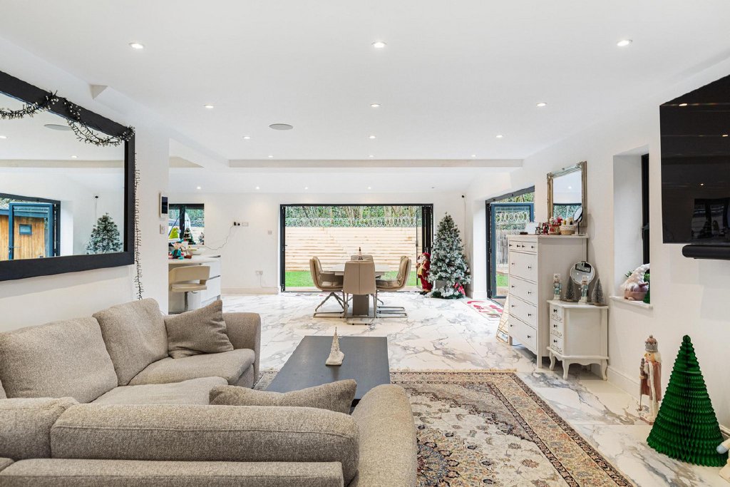 A particularly notable feature is the fully self-contained summer house, offering a second kitchen and reception space alongside a private sauna. This versatile addition lends itself perfectly to entertaining, wellness use, guest accommodation or a high-end home office, while maintaining separation from the main house.
