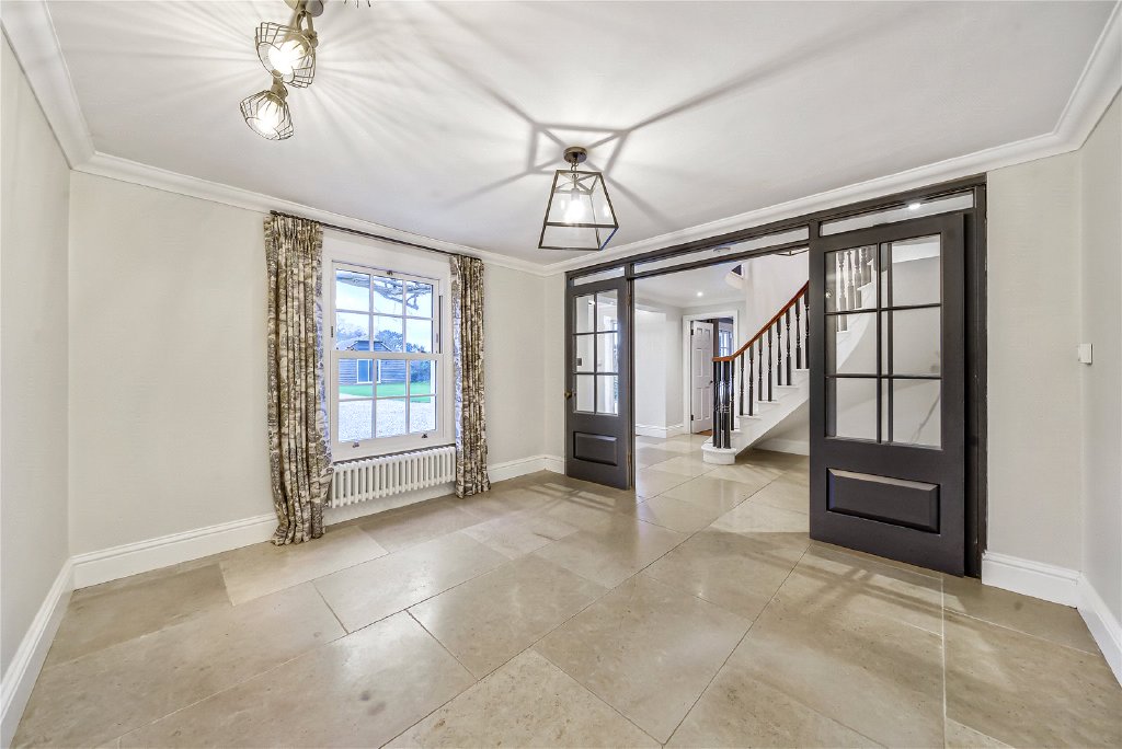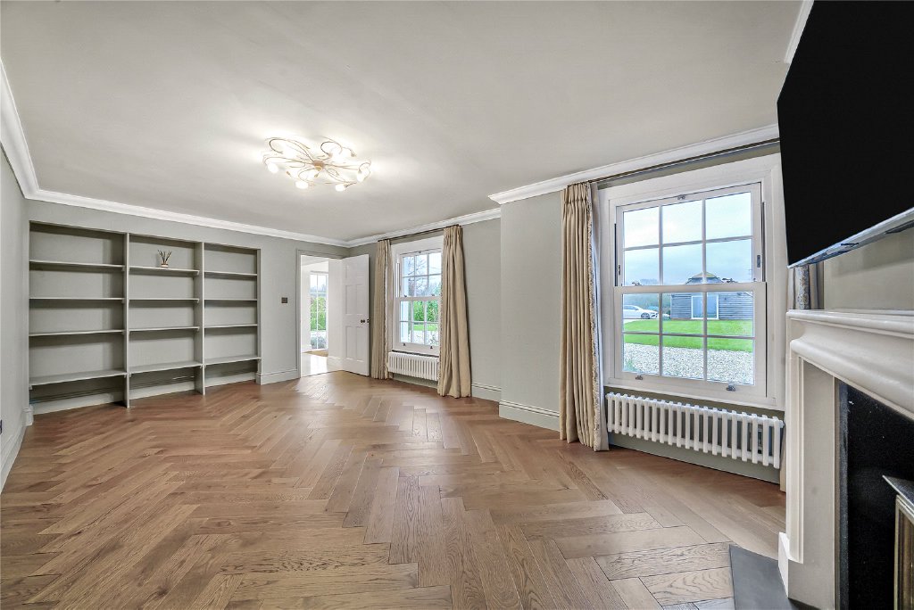 To the left, the drawing room exudes Georgian charm, with herringbone flooring and a wood burner forming a cosy focal point. Double doors lead seamlessly into a well-proportioned snug or study, a versatile space for quiet reflection or work.