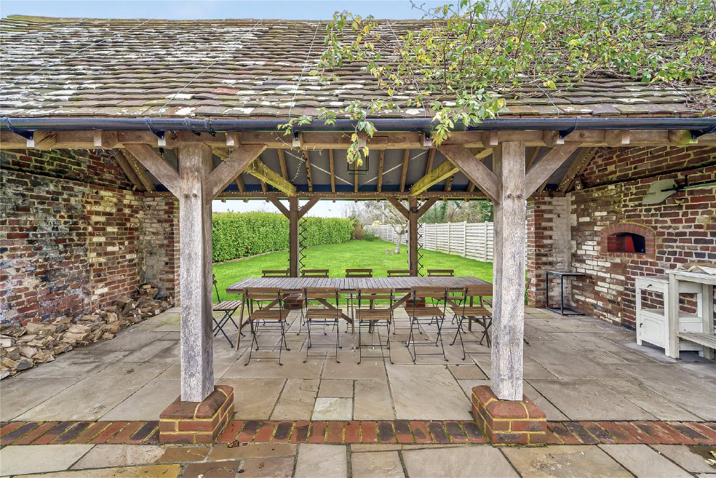 The gardens are a celebration of outdoor living. Manicured lawns, south-facing terraces, and raised beds for homegrown produce create a sense of harmony. From the kitchen, a courtyard garden unfolds into an entertainer’s haven, with a covered oak dining area, pizza oven, and large patio terrace, perfect for long summer afternoons. Beyond lie further lawns and colourful flower beds, all beautifully maintained.