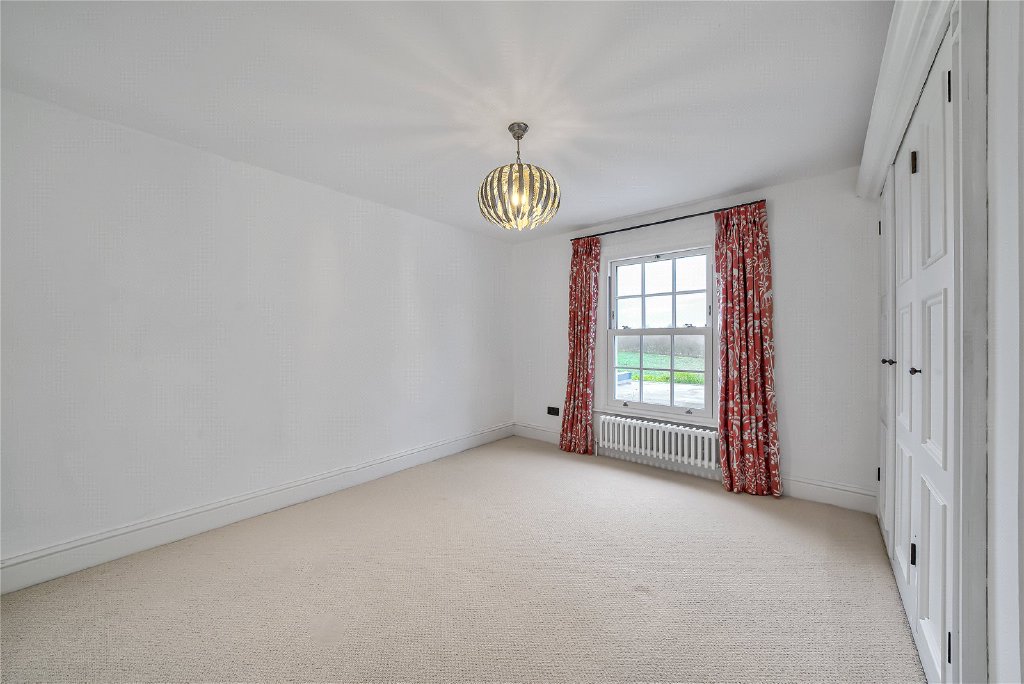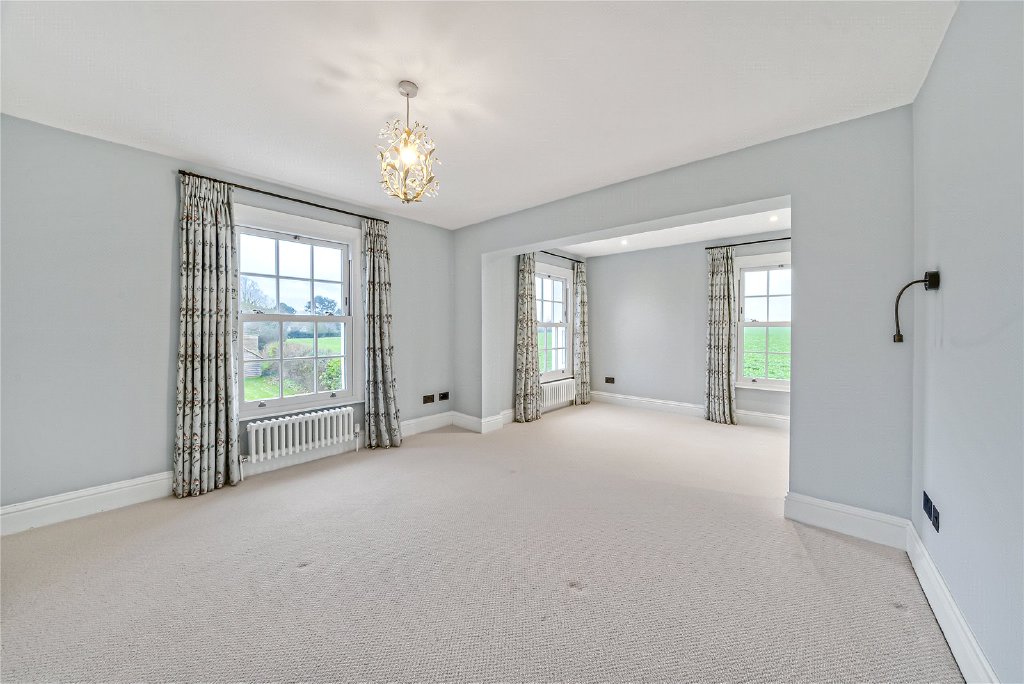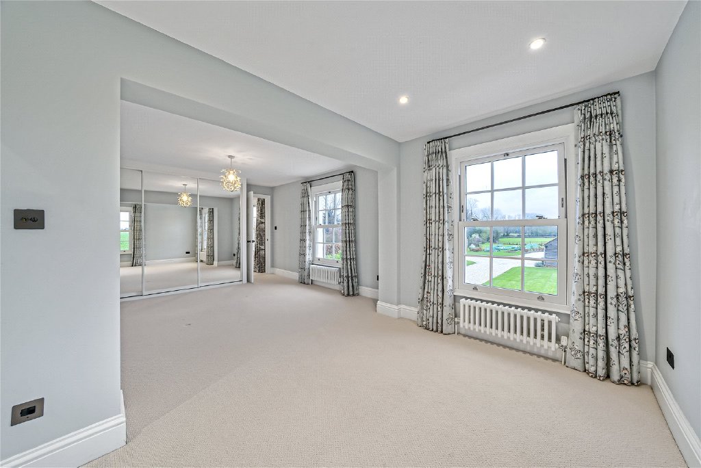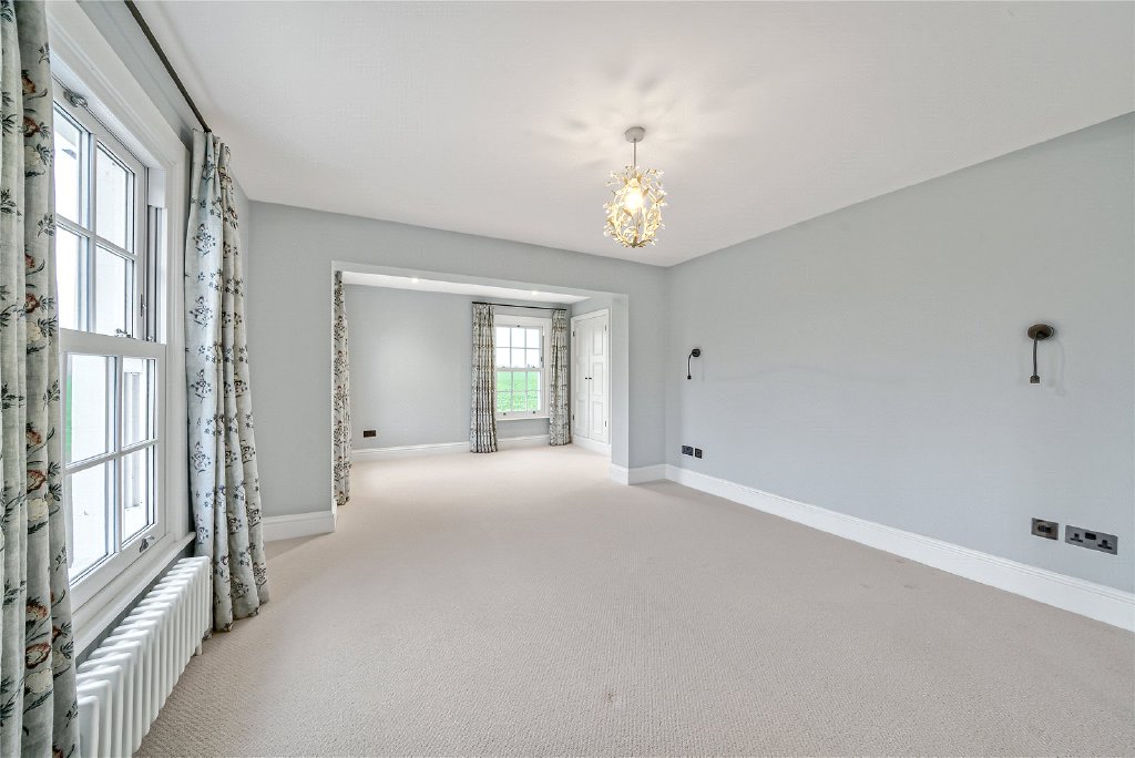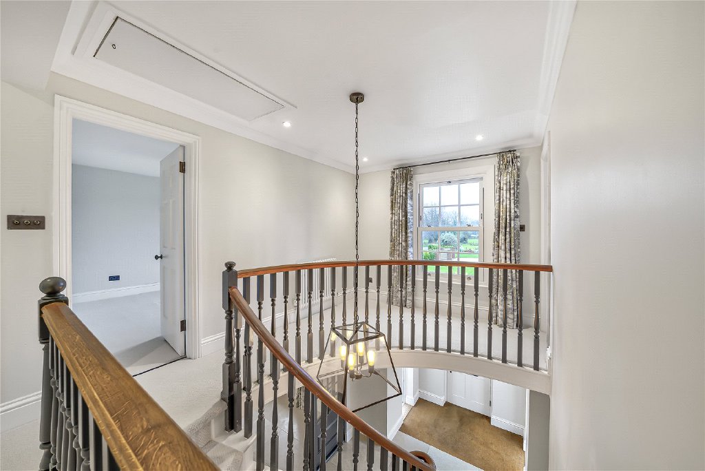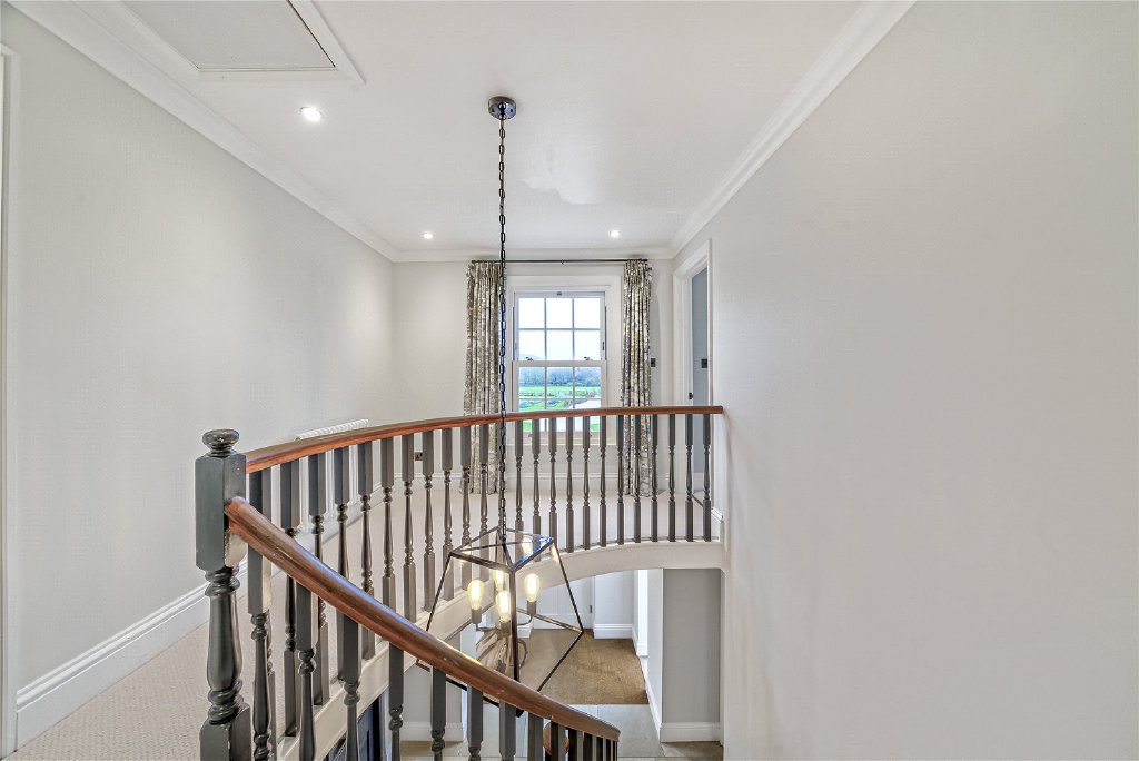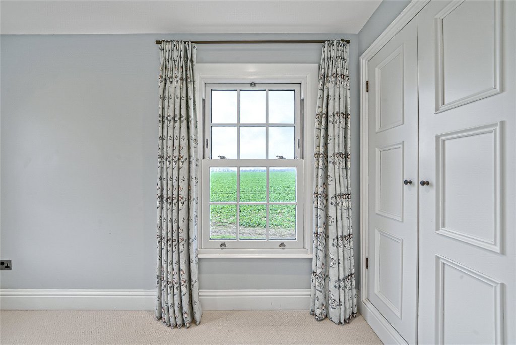 On the first floor, four beautifully proportioned bedrooms extend the sense of elegance and light found throughout the house. Each room is framed by Georgian-style sash windows, drawing in natural daylight and offering breathtaking views across the surrounding countryside. The principal suite is a sanctuary in itself, complete with a luxurious en suite bathroom, while a thoughtfully designed guest bedroom also enjoys its own private facilities. The remaining bedrooms are equally inviting, sharing a sumptuous family bathroom that combines comfort with refined style. Together, these rooms create a harmonious balance of space and serenity, perfectly suited for both family living and visiting guests.