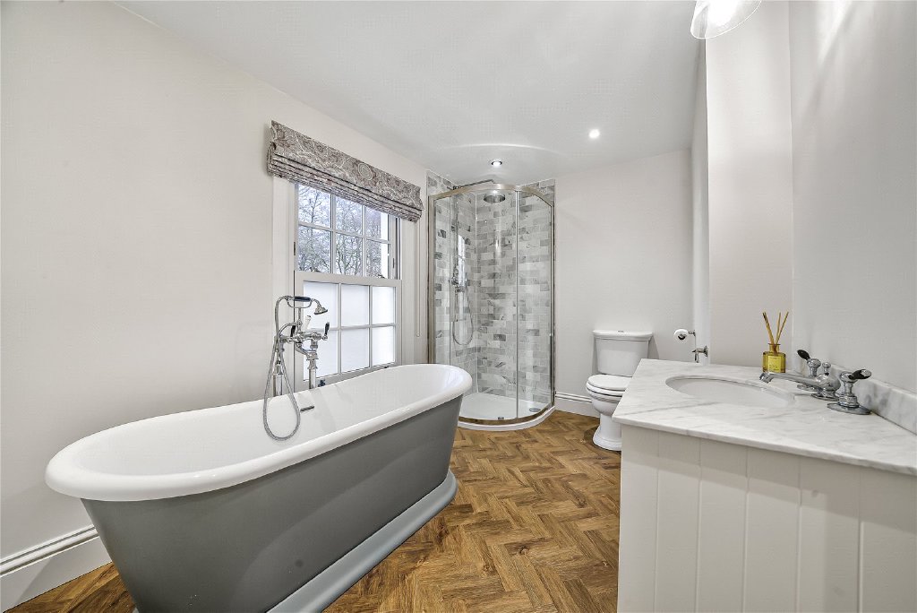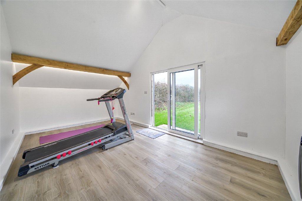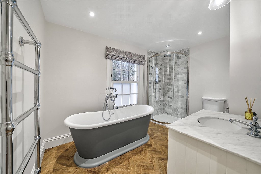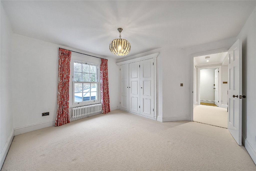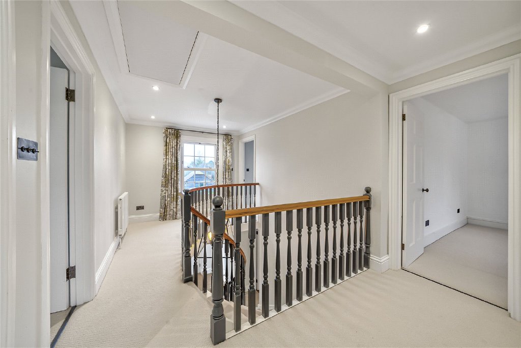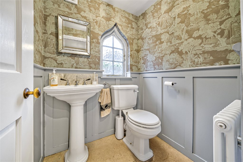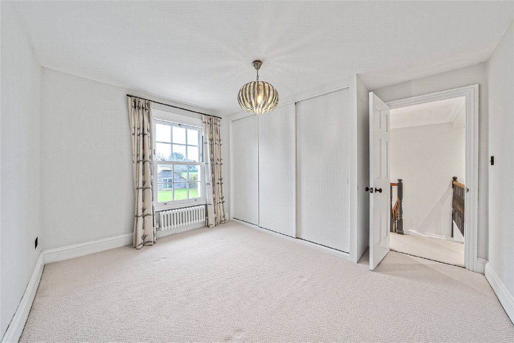 On the first floor, four beautifully proportioned bedrooms extend the sense of elegance and light found throughout the house. Each room is framed by Georgian-style sash windows, drawing in natural daylight and offering breathtaking views across the surrounding countryside. The principal suite is a sanctuary in itself, complete with a luxurious en suite bathroom, while a thoughtfully designed guest bedroom also enjoys its own private facilities. The remaining bedrooms are equally inviting, sharing a sumptuous family bathroom that combines comfort with refined style. Together, these rooms create a harmonious balance of space and serenity, perfectly suited for both family living and visiting guests.