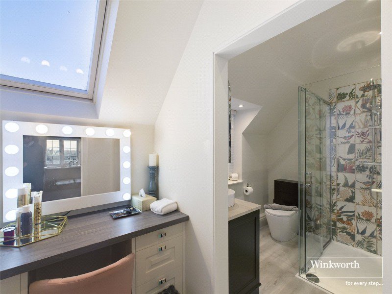 Inside, calm, light-filled interiors set a restful tone throughout. The primary suite offers hotel-style luxury, featuring air conditioning, bespoke wardrobes, a dressing area and a beautifully refurbished en-suite with walk-in shower and underfloor heating. A second double suite mirrors this level of comfort, complete with its own dressing area, fitted wardrobes, air conditioning and a refined en-suite with a classic roll-top bath — ideal for slow mornings and peaceful evenings.