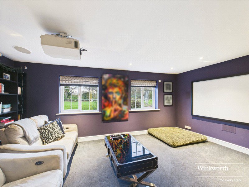 The second wing introduces exceptional versatility. A generous ground-floor reception room provides the option of an additional bedroom, studio or creative space, while the dedicated cinema room — equipped with a 90-inch projector and screen — promises immersive film nights. Two further double bedrooms and a contemporary family bathroom complete this wing, perfect for guests or independent living.