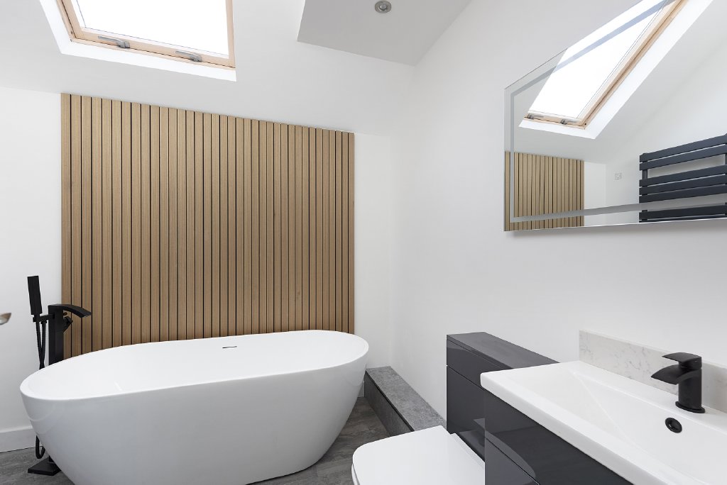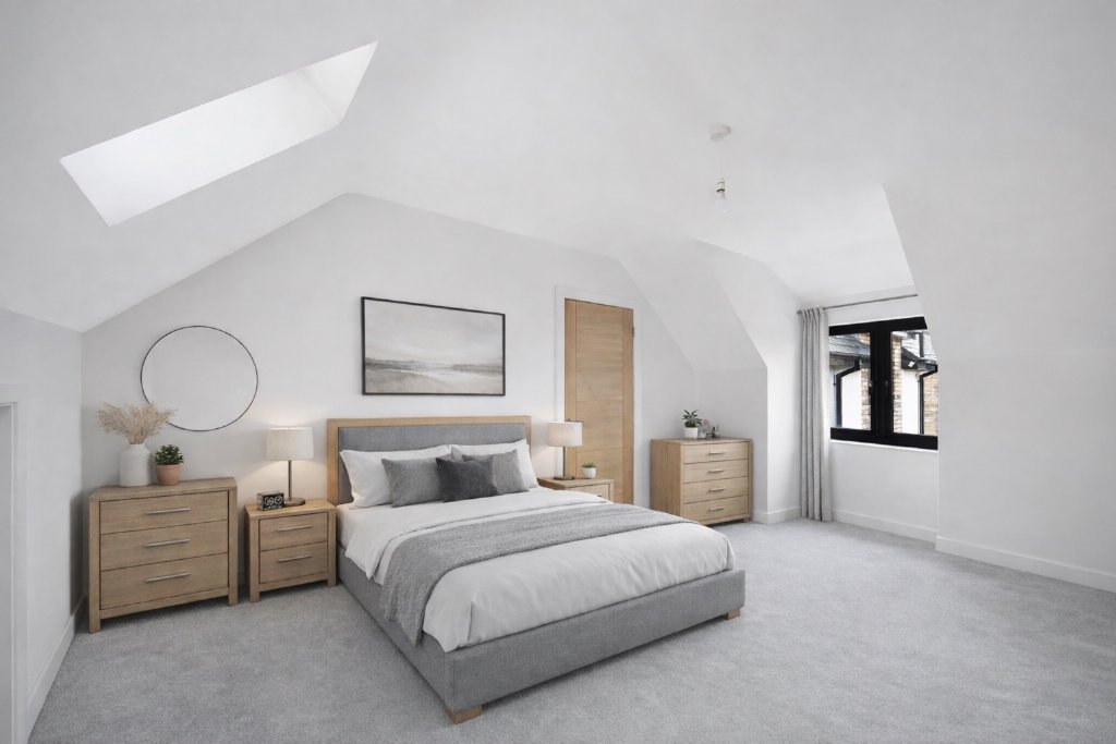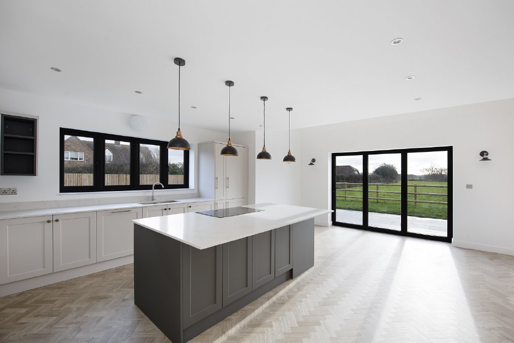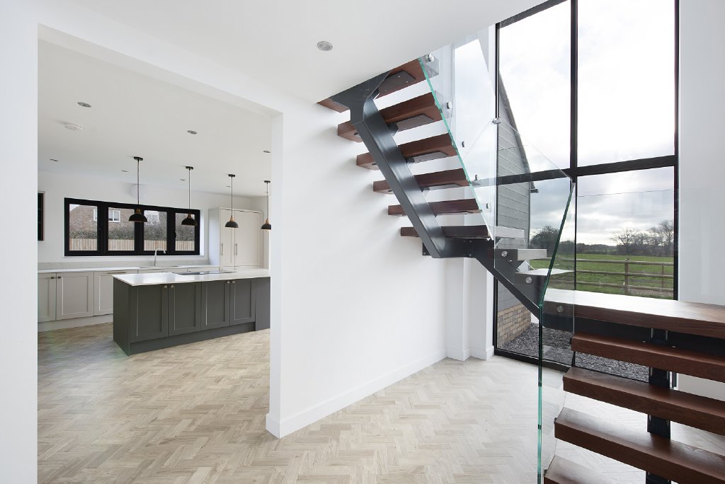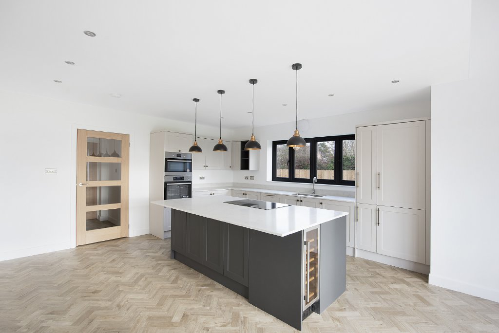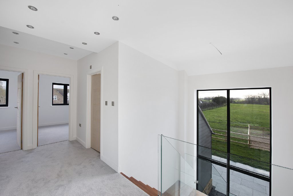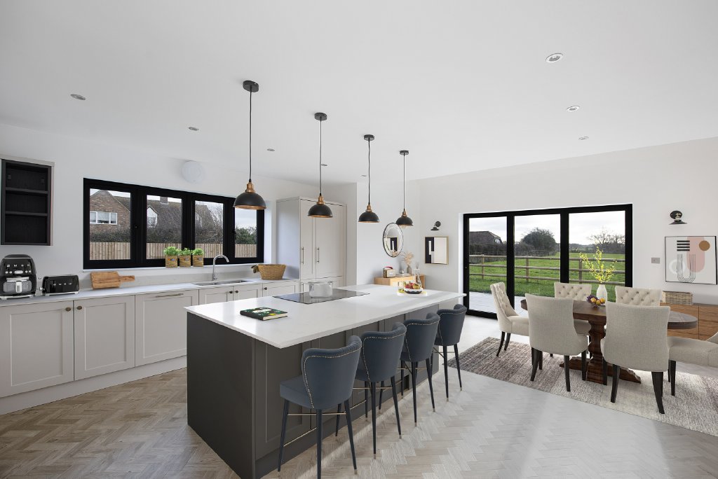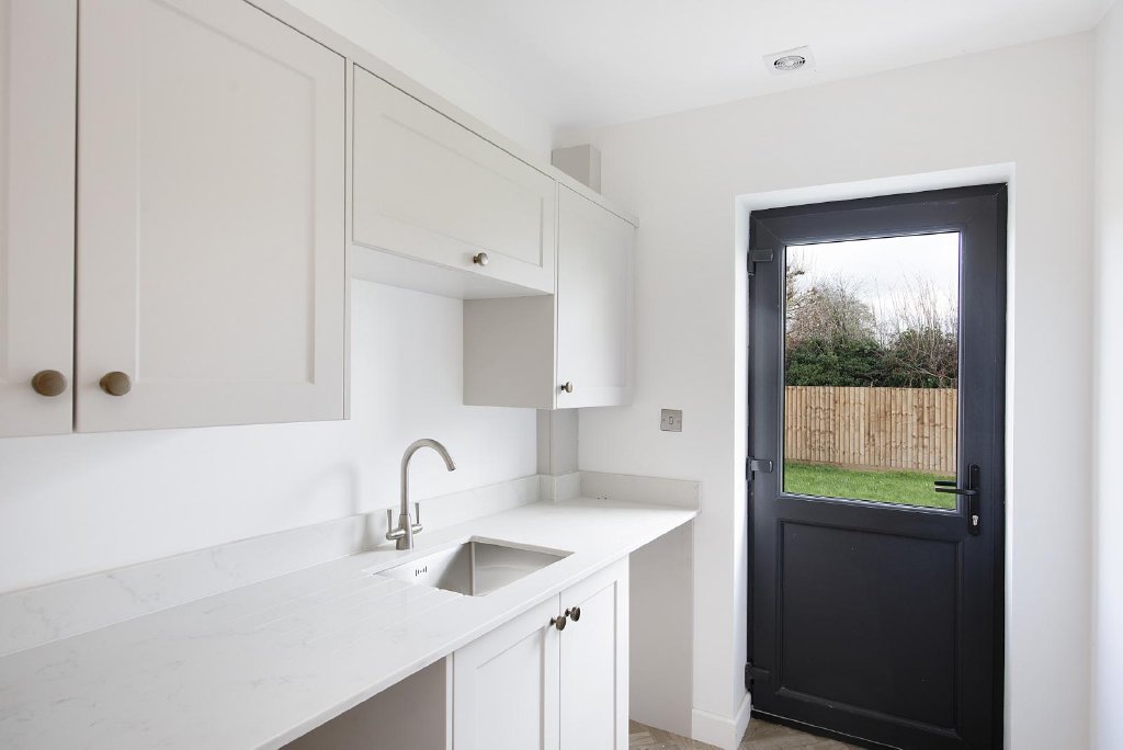 The living spaces have been thoughtfully designed around modern life, with a stunning full-height reception hall and designer floating staircase beautifully framing the entrance. At the heart of the home lies a superb kitchen dining family room fitted with bespoke cabinetry, quartz worktops and quality integrated appliances. Part-vaulted ceilings and bi-fold doors flood this sociable space with natural light and create a seamless connection to the terrace, ideal for entertaining or relaxed family living throughout the year.