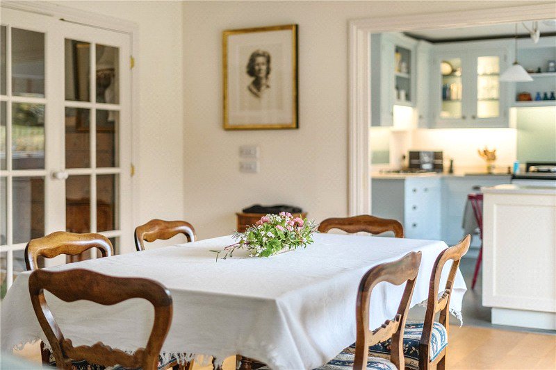 The hall leads into the Dining/Family room with french doors to the westerly terrace and french doors to the conservatory, offering a great entertaining space that seamlessly flows into the kitchen with sleek cabinetry, quartz work tops and premium appliances. Lpg 3 oven Aga with Neff 4 ring gas hob, an integrated single Neff oven/microwave, fridge/freezer and dishwasher complement the kitchen. Adjacent to the kitchen is a large boot room with storage and door out to a paved terrace. The boot room separates the kitchen and utility room which is a good size and has an under-counter Miele washing machine and separate dryer, water softener and ample cupboards.