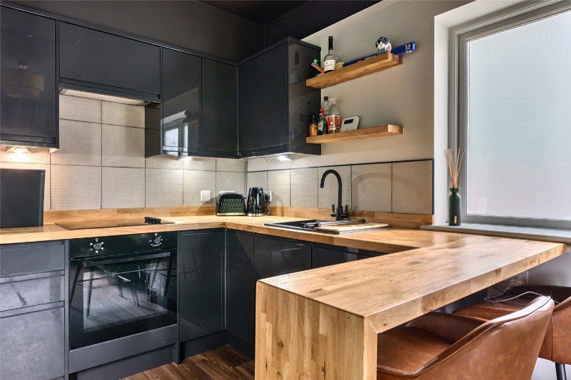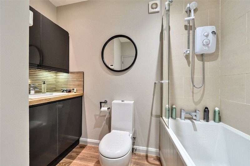 Upstairs there are two double bedrooms, the principal bedroom has a dressing room with sleek built in wardrobes and units and feels spacious, the second bedroom also benefits from good storage.