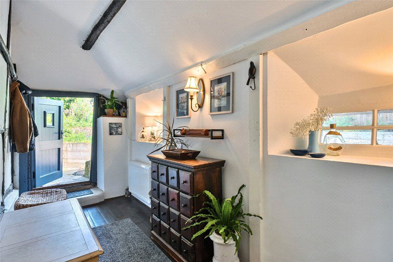 Bursting with character, light and with good ceiling height, stepping inside you will find the cosy living room which features a traditional inglenook fireplace, now fitted with a woodburning effect stove, blending historic charm with modern comfort.” A delightful cottage kitchen/breakfast room featuring exposed beams, wooden cabinetry and a cosy, homely feel—perfect for everyday family life.” Off the kitchen is a useful room with pantry style cupboard and integrated fridge/freezer, this leads into a modern shower room. Beyond the living room is a superb large boot room perfect for drying off dogs, storing outdoor equipment and managing the essentials of country life which leads to the back garden.