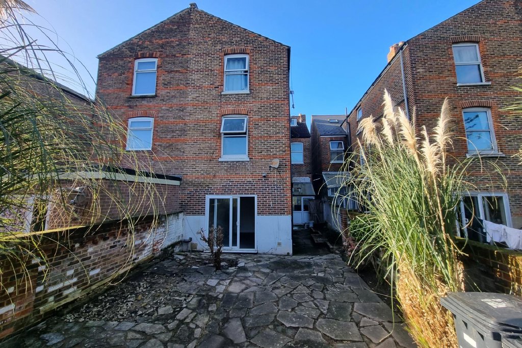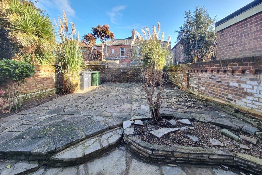 OUTSIDE Paved easterly facing rear garden, side pedestrian access.