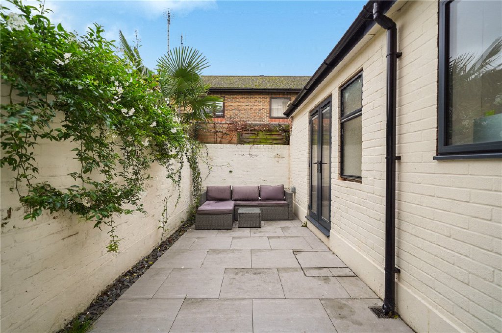 The ground floor boasts a spacious double reception room, a modern kitchen, a study/fourth bedroom, and a W.C. Two sets of double doors open onto a south-facing patio garden, perfect for outdoor entertaining.