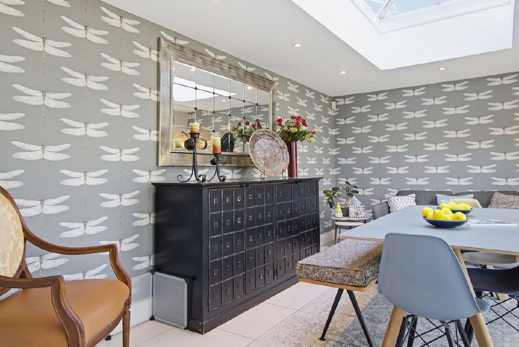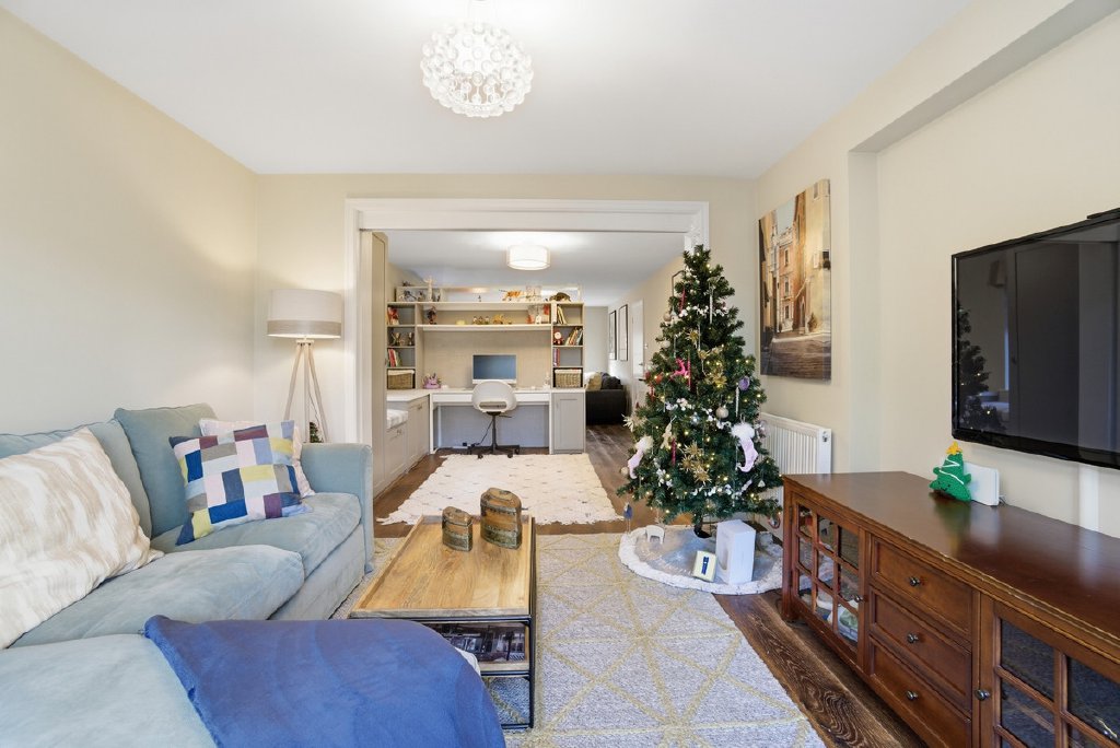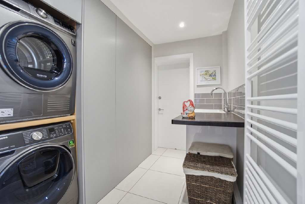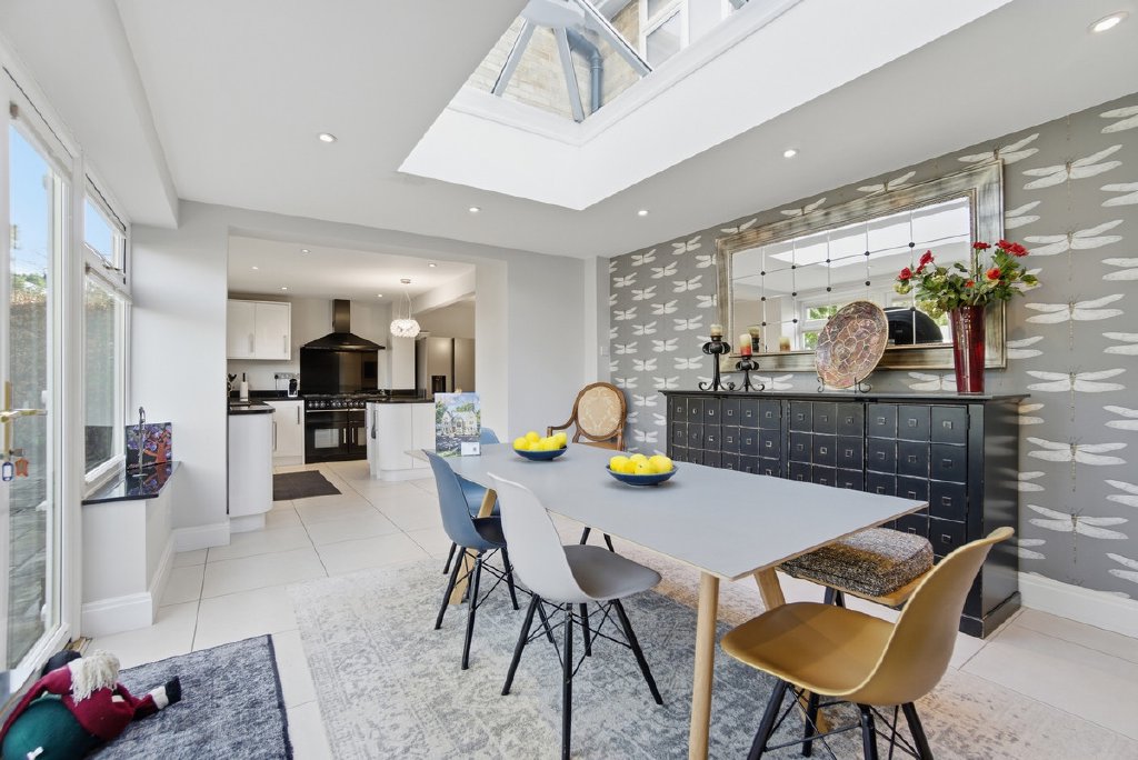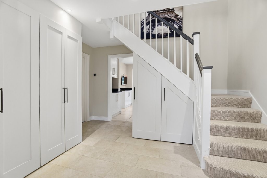 At the front of the house there is plenty of off street parking as well as a garage, The wide entrance hallway has a cloakroom as well as plenty of bespoke storage space for shoes and coats. Off to the side is a full length triple zoned living space with French doors at the rear section leading out onto the garden. On the other side is another reception, currently used as a study. The large L-shaped kitchen and dining area has a great array of cabinetry and modern appliances and a central island. The dining area has a lantern ceiling and doors leading out onto a good sized private garden that is mostly laid to lawn. Off of the kitchen is a utility area with more cabinetry and a door leading to the integral garage.