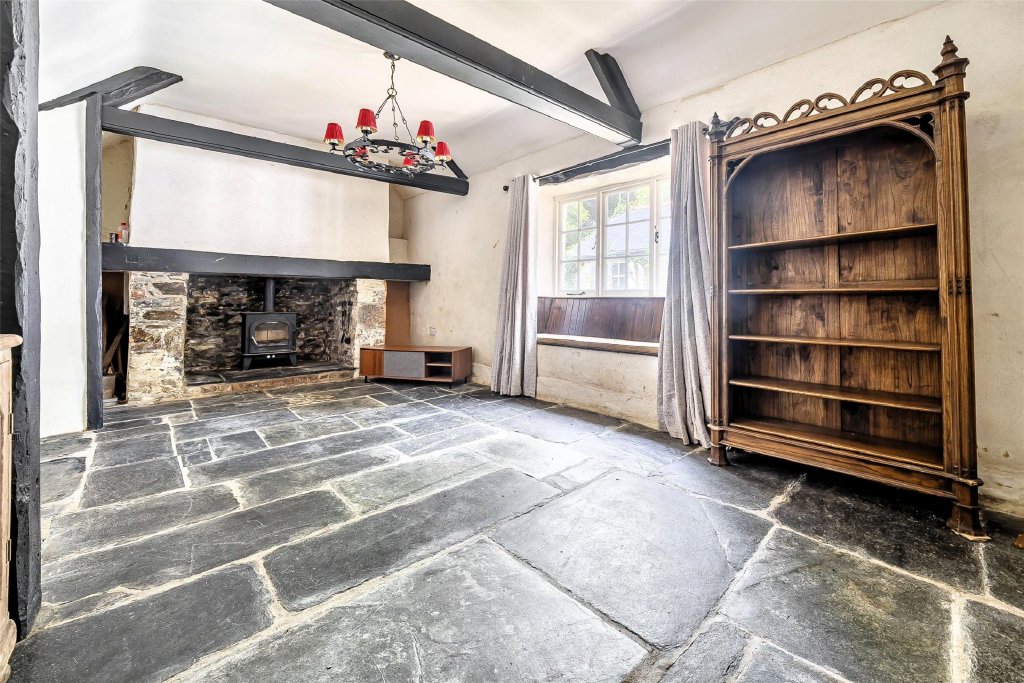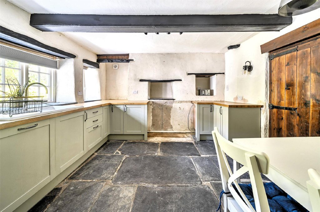 To the rear of the house, the kitchen is fitted in a shaker style with slate flooring, ceramic sink, Quooker boiling water tap and integrated appliances. Beyond lies a boot room and a characterful family room with exposed ceiling timbers and a further wood-burning stove, creating a comfortable everyday living space. An elevated former apple store, with restricted ceiling height, provides a flexible additional room suitable for hobbies, occasional accommodation or home working.