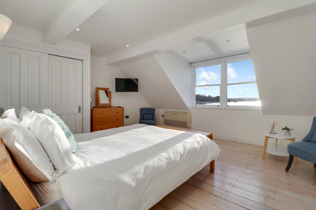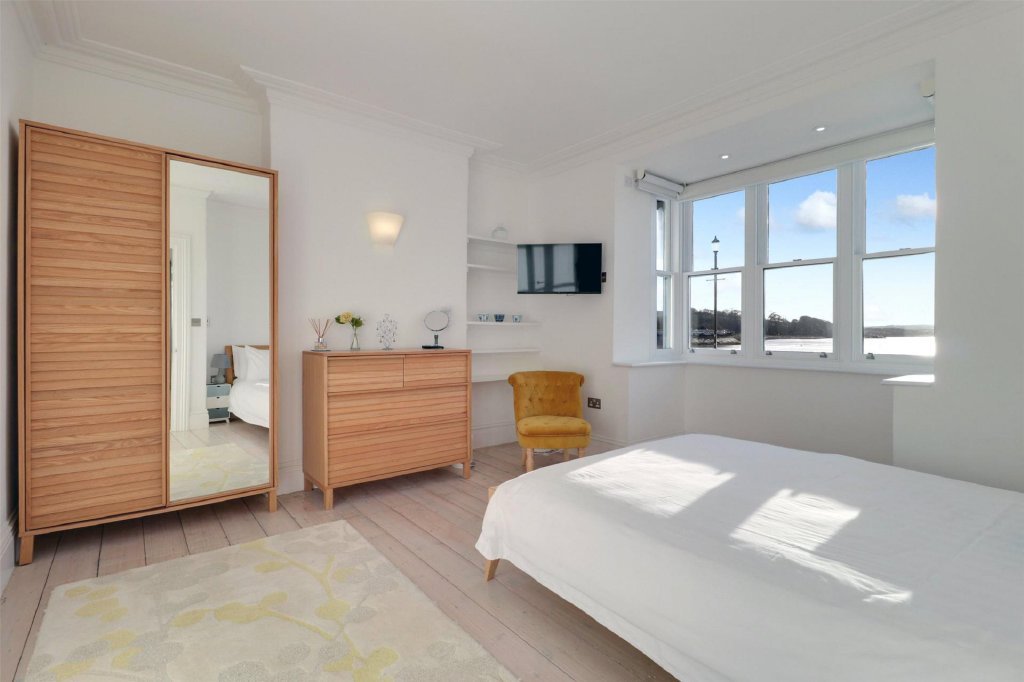 From the sitting area, a further staircase leads to the second floor and an impressive principal suite. This generous master bedroom enjoys elevated river views and offers a peaceful retreat, with fitted storage and a large en-suite shower room featuring WC and twin “his and hers” wash basins. The outlook from here is particularly special – a wonderful vantage point to wake up to the estuary each day.