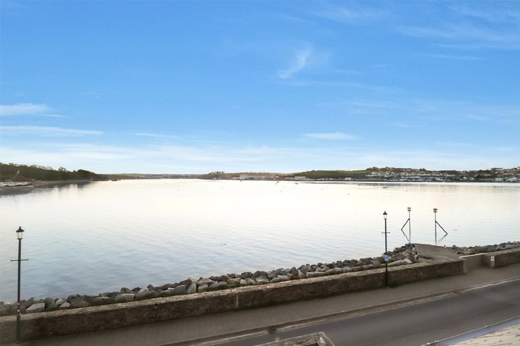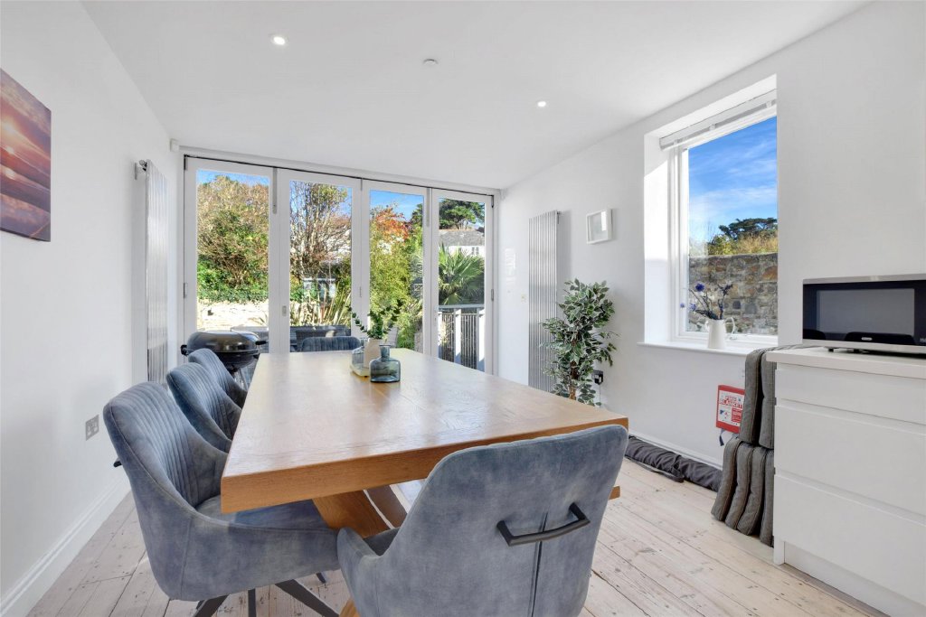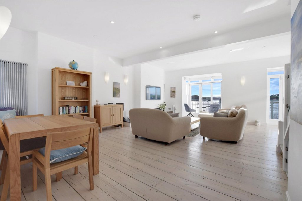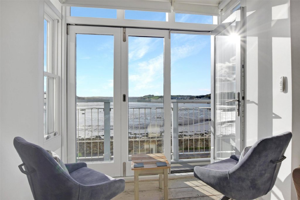 Stairs rise to the first floor where the accommodation truly comes into its own. Here, an outstanding open-plan living, dining and kitchen space has been thoughtfully designed to maximise the exceptional estuary views. Expansive glazing and bi fold doors to the front flood the room with natural light and open directly onto a balcony overlooking the estuary – the perfect spot for morning coffee, sundowners or simply watching the ever-changing tides. The contemporary fitted kitchen provides ample preparation and storage space, alongside room for a large family dining table, while the sitting area offers a relaxed setting for entertaining and gathering. To the rear, further bi-fold doors open onto a private area of composite decking, enclosed by substantial stone walls to create an intimate and sheltered space for alfresco dining.