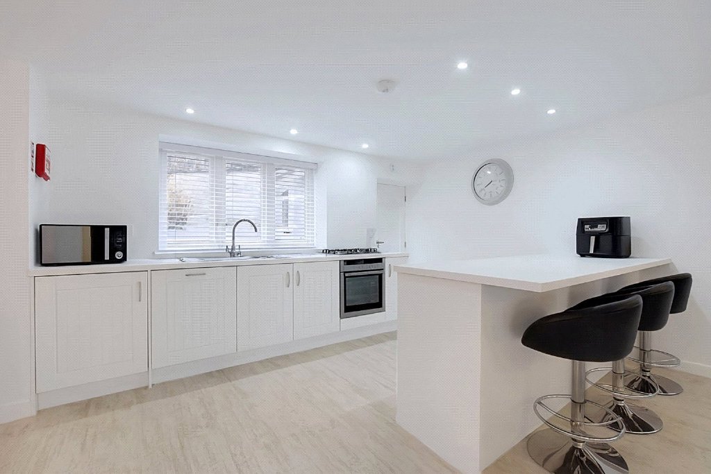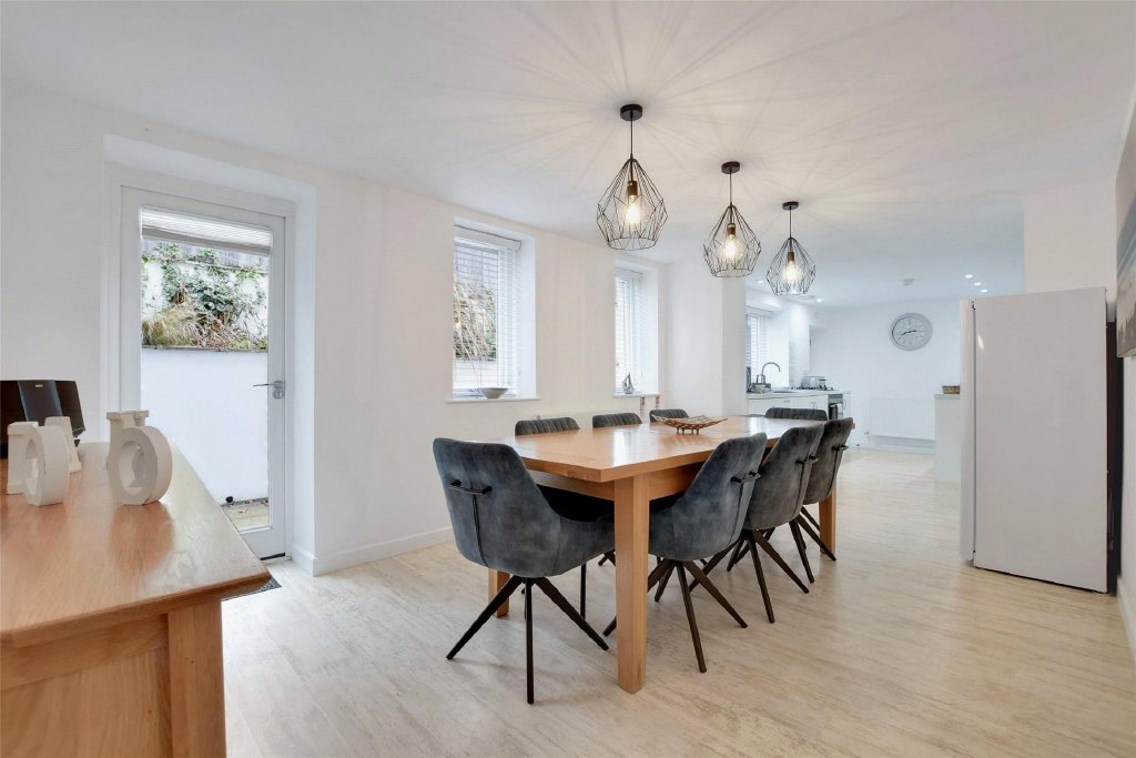The ground floor has been thoughtfully configured to create a superb open-plan living space, ideal for modern family life and entertaining. A sleek, contemporary kitchen flows effortlessly into the dining and sitting areas, forming a sociable heart to the home where natural light pours in and French doors encourage an easy connection with the outside. It is a space equally suited to relaxed evenings in as it is to hosting family and friends.