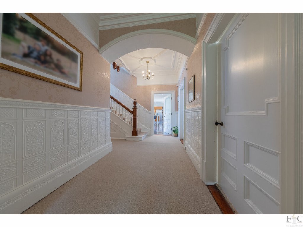 The entrance porch is light and airy and leads into the hall similarly so. Corniced high ceilings, panelled doors and stained glass contribute to the grand country house impression as large reception rooms face each other across the hall.