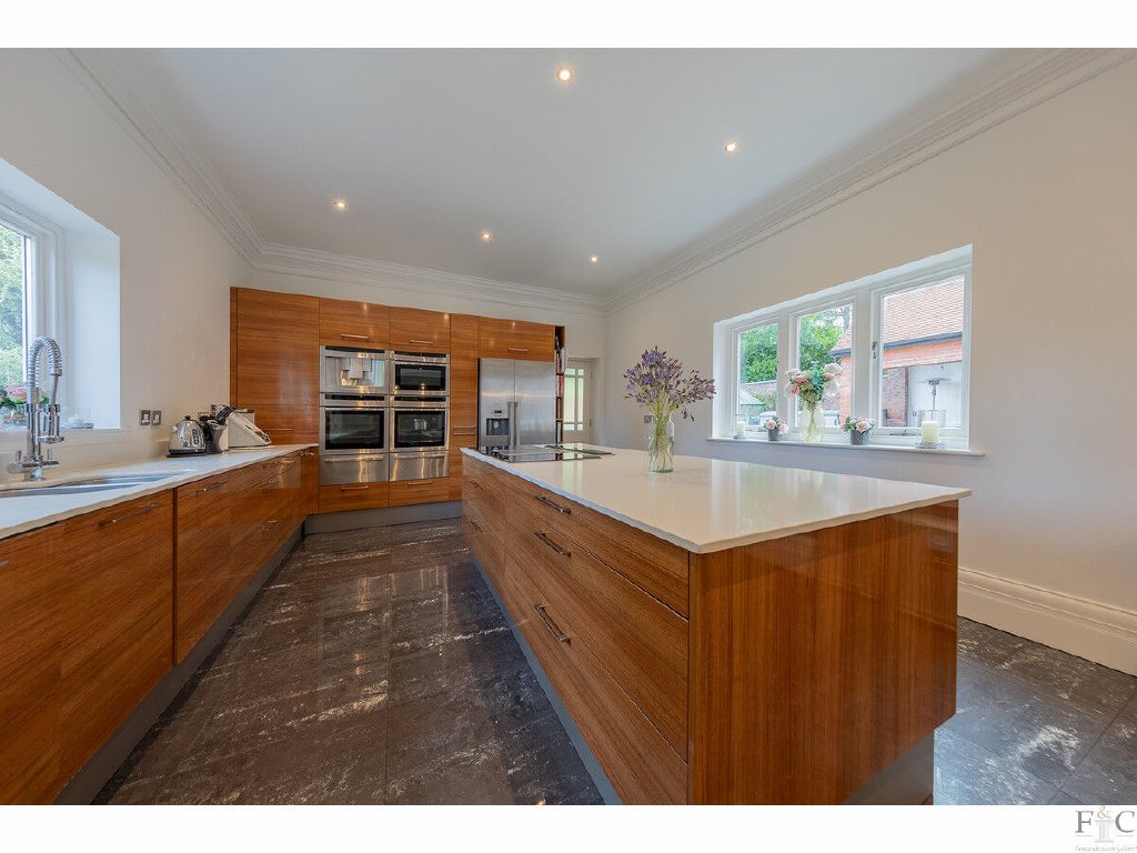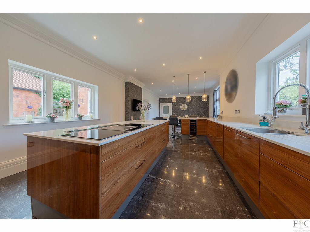 The impressive kitchen has been extended and is fitted with a generous selection of Dewhirst wall and floor units above a porcelain tiled floor, which has under floor heating. Silestone worktops provide ample surface area for food preparation and coordinate with an island unit and breakfast bar to complete the contemporary style of the room.There is an integrated selection of high quality appliances by de Dietrich and Neff: two ovens, fridge freezer, dishwasher, a ceramic hob, boiling water tap, microwave, coffee machine and two warming drawers. The sink unit is traditionally positioned under the window to take advantage of the garden views. This room has dual aspects and double doors opening onto the patio. It easily accommodates additional furniture to incorporate an informal living room/seating area or table.