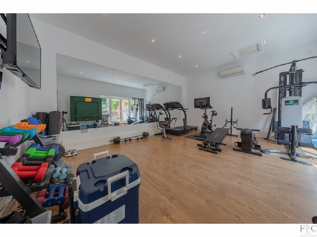 The former room is a very versatile space and has been equipped for a wall mounted television. This room has access to the utility room, which opens into the walled courtyard. Across this is the final reception room, the airconditioned gym. Another versatile space, this room could serve for multiple purposes and opens through double doors from the secluded courtyard or from a covered passageway linking the kitchen to a rear exit into the back garden.
