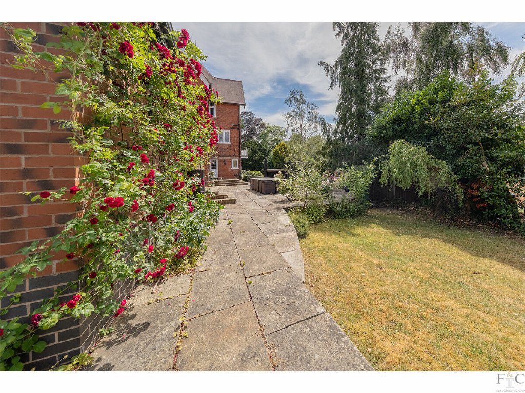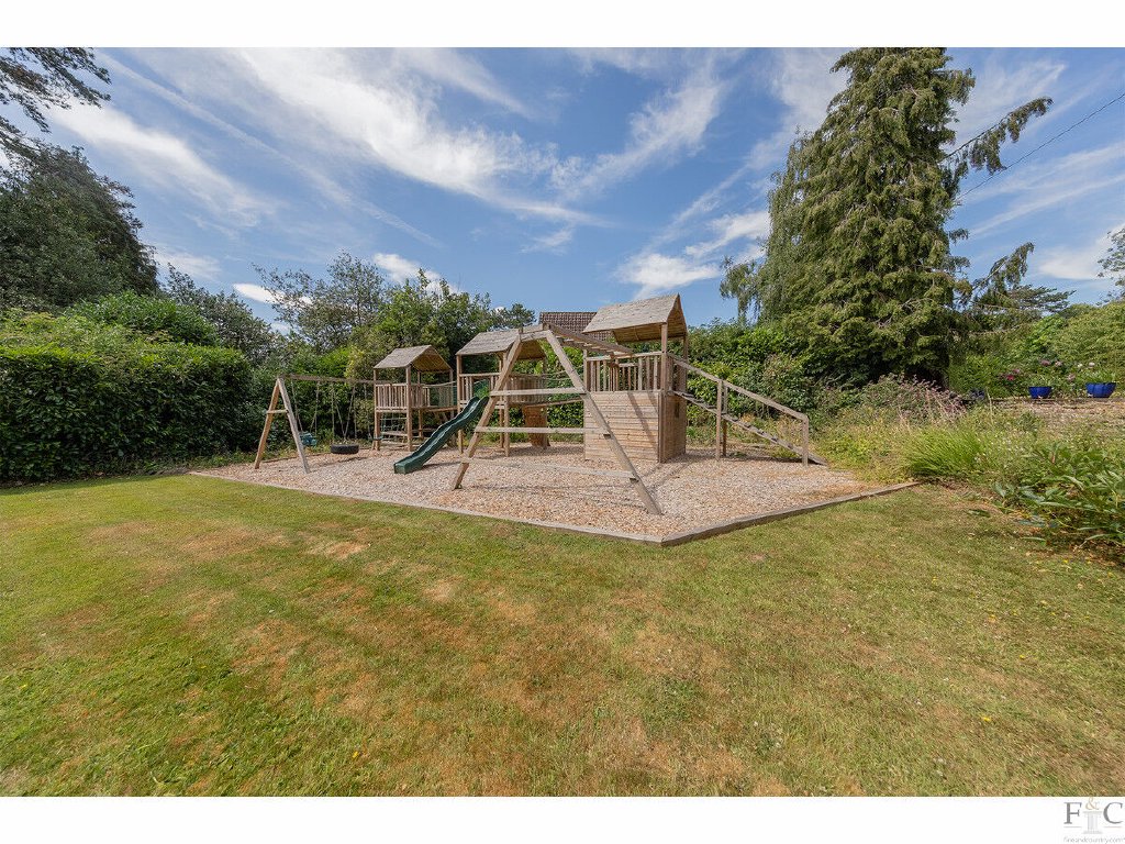 Outside, the grounds consist of a generous landscaped garden with lawns suitably sized for football, cricket or tennis and established planted borders . A designated south facing children's play area was newly equipped with wooden climbing apparatus in 2021. For alfresco dining there are various outside entertainment spaces including a west facing patio and an enclosed walled courtyard offering a garden room with lighting. All provide seclusion and privacy from which to enjoy the many established roses, shrubs and trees filling the large garden.