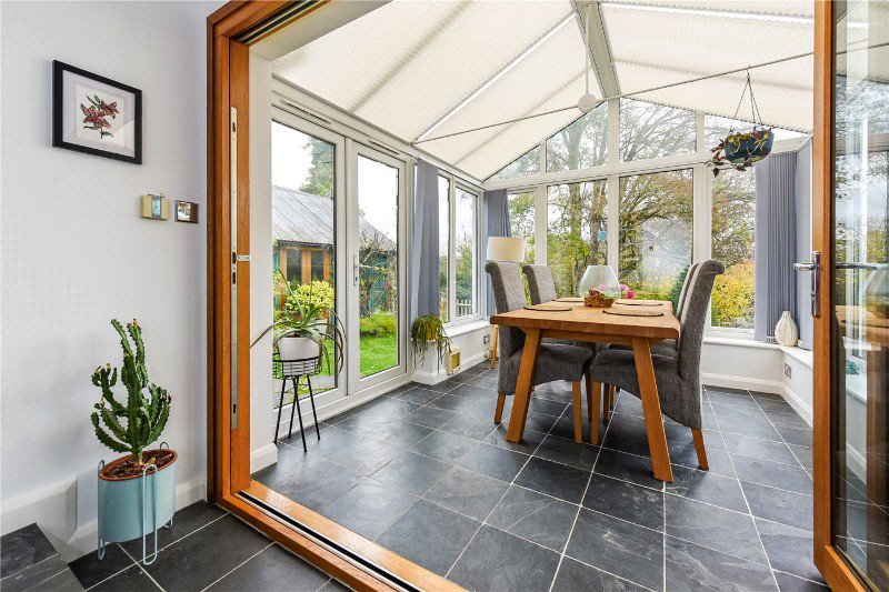 At the heart of the home lies a beautifully designed kitchen, combining a contemporary country aesthetic with modern craftsmanship. Soft neutral cabinetry, white quartz worktops, and terracotta tiled flooring all create a welcoming ambience, complemented by exposed beams and pendant lighting. The conservatory just off the hallway offers a light-filled dining or garden room, with tiled flooring and wide glass doors opening directly onto the terrace and landscaped garden beyond.