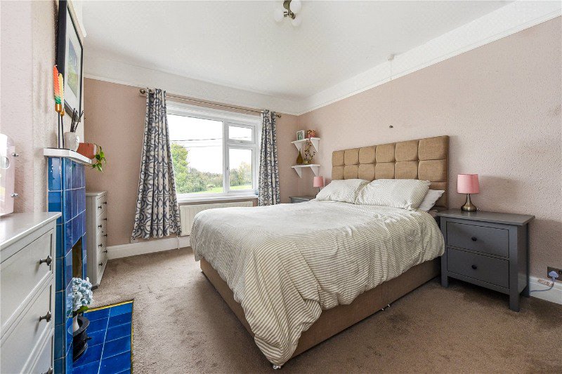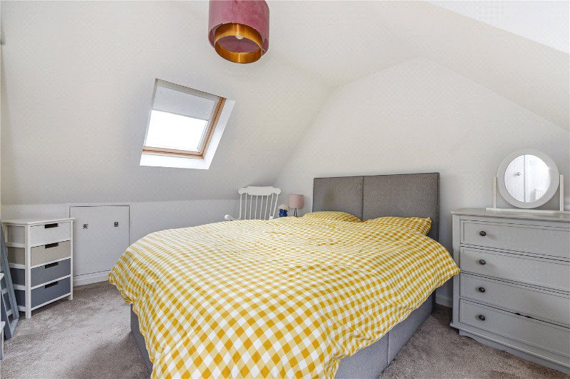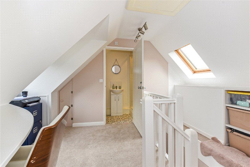 Upstairs, the good-sized principal bedroom enjoys tranquil countryside views and a charming, blue-tiled fireplace. Both additional bedrooms on the first floor are equally charming, with wide windows overlooking the front and back garden. The family bathroom is well-appointed, with attractive patterned floor tiles, a curved bath, and chrome fittings adding a touch of vintage charm. The top floor is home to a super loft conversion with an en-suite shower room - perfect as a guest suite, children’s bedroom, or creative workspace - enhanced by vaulted ceilings, Velux windows, and eaves storage.