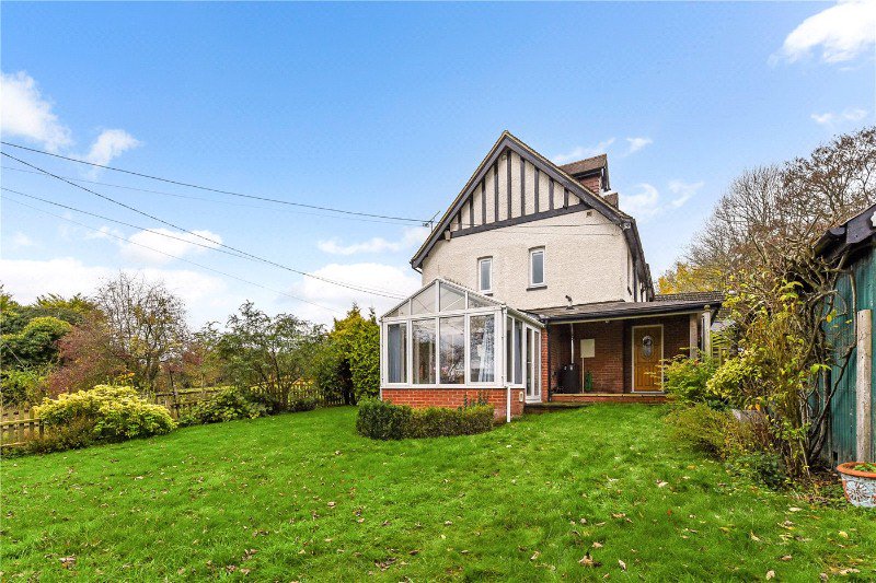 Tucked away along a peaceful lane and surrounded by mature greenery, this charming semi-detached period home perfectly balances timeless character with modern style. The house is attractively traditional from the front, with mock-Tudor gable detailing and red brick accents. Inside, the impressive entrance hall leads through to a sitting room which exudes warmth and character, centred around an exposed brick fireplace with a timber mantle. Oak-style flooring, plantation shutters, and a staircase with white-painted balustrades - complete with bespoke under-stair storage and shelving - provides both practicality and charm to the space.