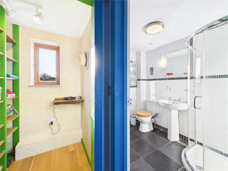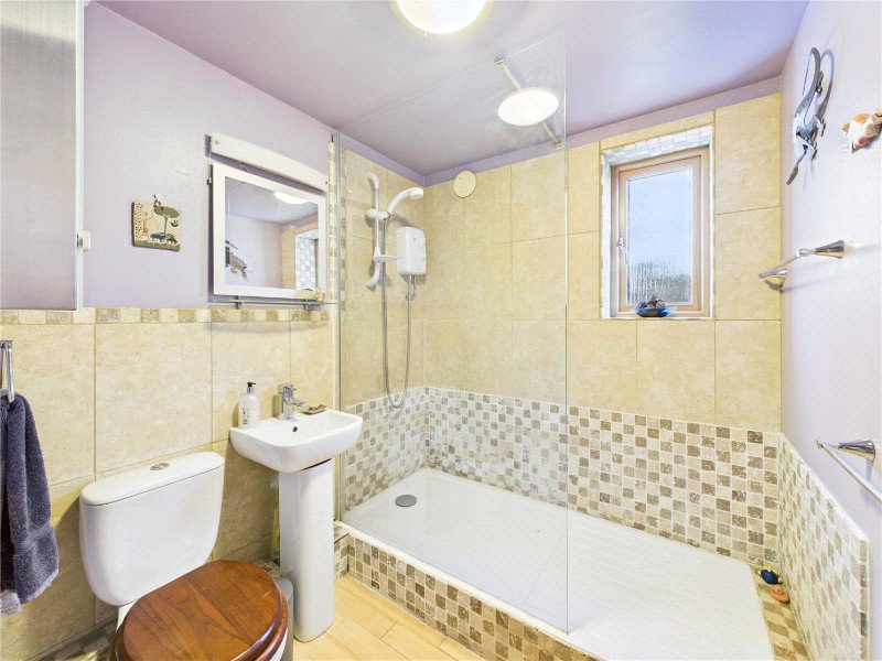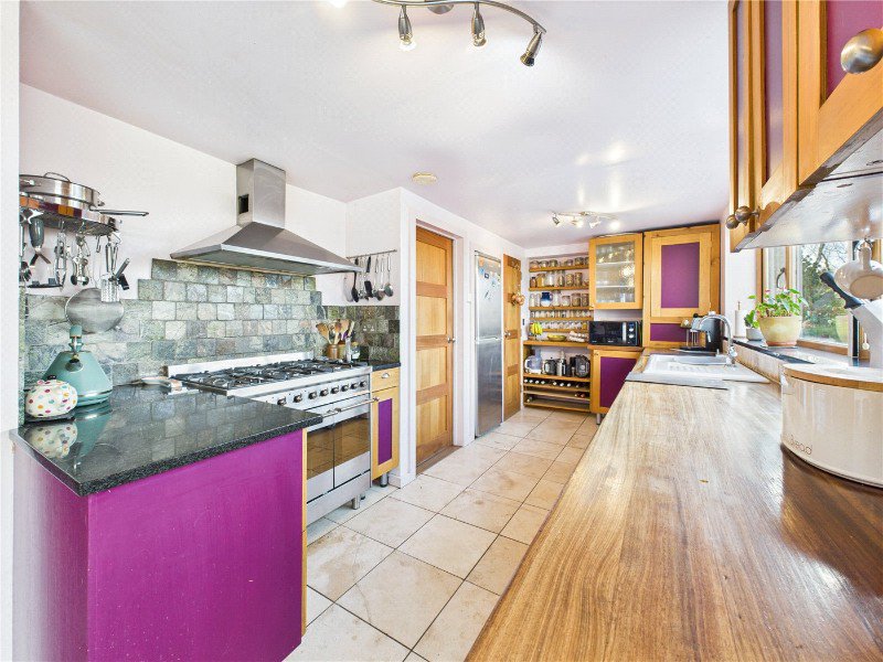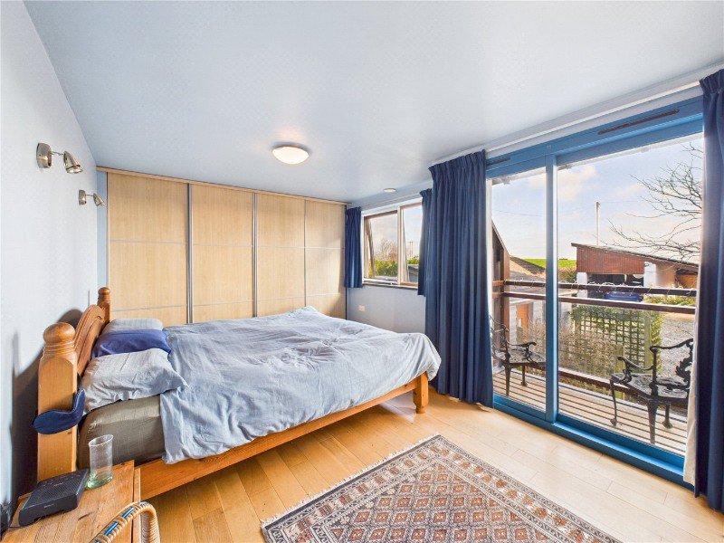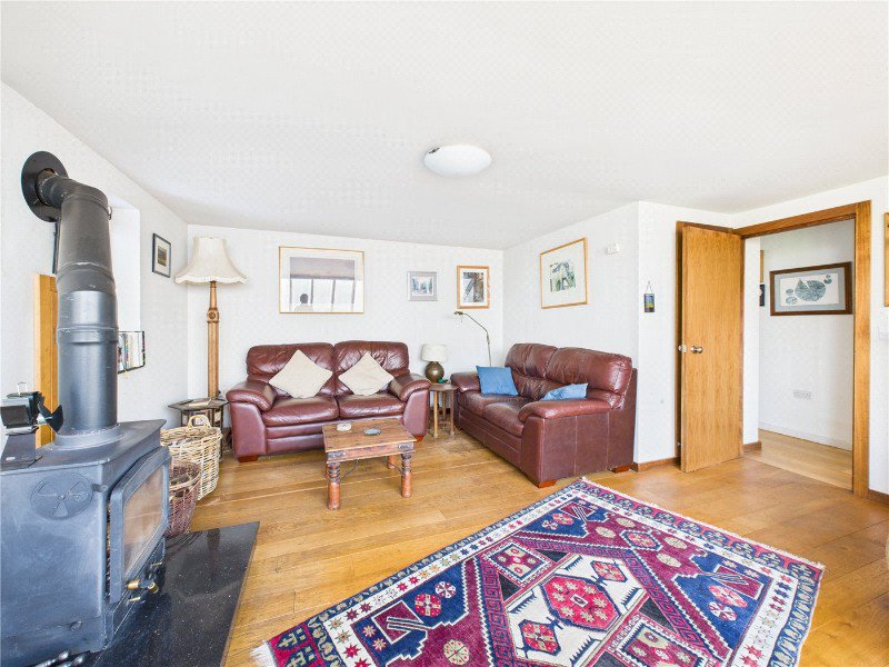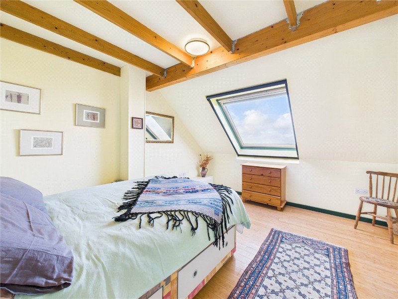 The ground floor comprises a front aspect sitting room, a double bedroom, bathroom, and a well appointed kitchen with utility room and larder store. A standout feature is the vaulted dining room, predominantly glazed and offering attractive views over the garden.