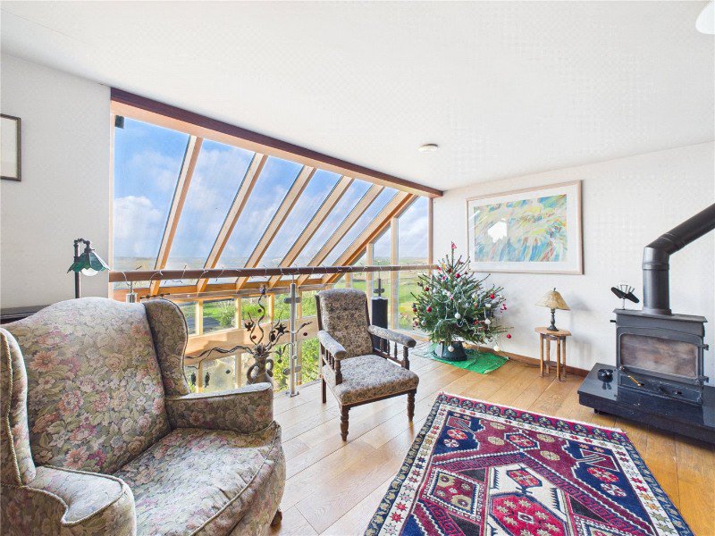 The first floor provides an impressive master suite, benefitting from excellent built-in cupboard storage, a private balcony, walk-in wardrobe and an ensuite bathroom. Also on this level is a study with rear-aspect garden and rural views. The main living room is a bright and spacious entertaining area, positioned on the mezzanine overlooking the dining room, enjoying far reaching views and featuring a wood-burning stove.