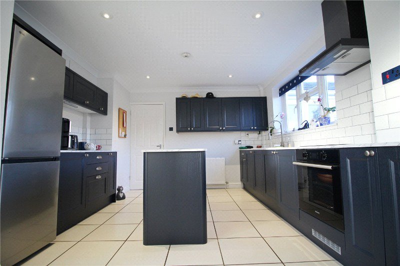 19’4 x 17’9 (irregular L shape) a fantastic living space again full of natural light and cleverly extended, with UPVC window to the rear aspect, UPVC windows to both side aspect, UPVC French doors onto the rear gardens and part glazed UPVC door to the front aspect, comprising a range of quality refitted range of base and eye level storage units, incorporating straight edge work surface with 1 ¼ sink inset with mixer tap over, subway style tiled splashbacks, central island unit, integrated oven and four ring hob with extractor fan over, plumbing and space for washing machine, ample space for a dining table, recessed storage cupboard with wall mounted boiler, radiator, power points, ceiling spotlights and tiled flooring.