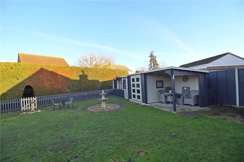 A wonderful spot toward the end of an established and popular cul de sac, the frontage is partially enclosed by low brick wall and laid gravel offering ample parking for four vehicles, leading to a SINGLE GARAGE 18’1 x 10’ with electric roller door, power and light with pedestrian door. Gated side access leads to the good-sized rear gardens, enclosed by fencing and mature hedging, shaped lawns with patio seating areas timber gazebo with further covered seating a summer house with French door, second summer house and hidden storage area giving access top both sides of the hedge.
