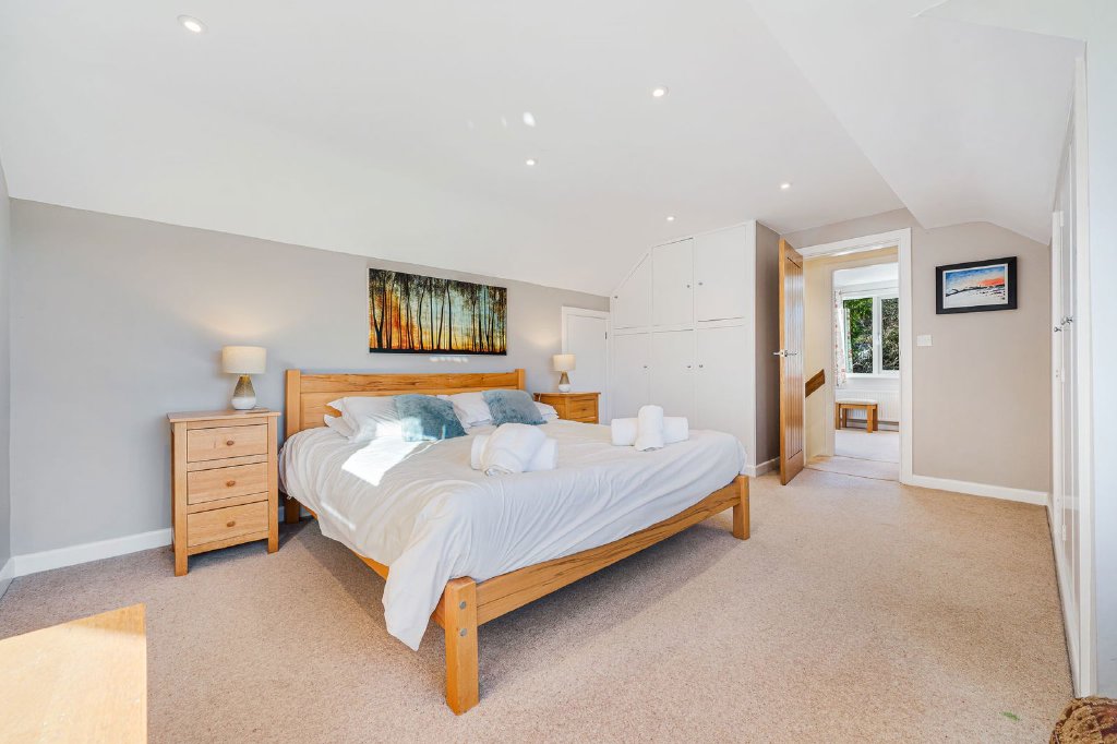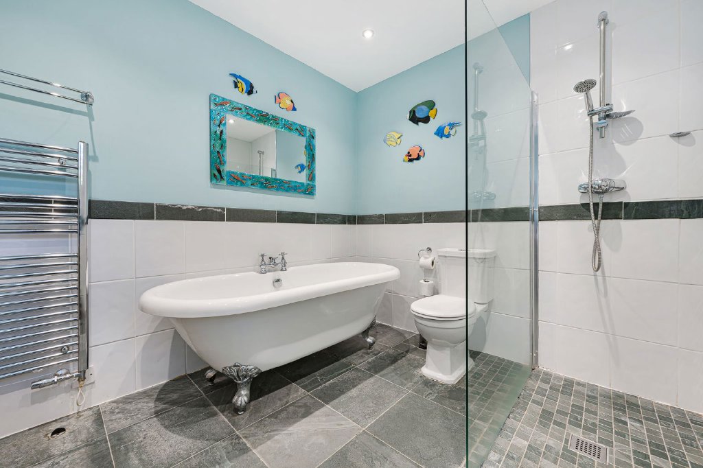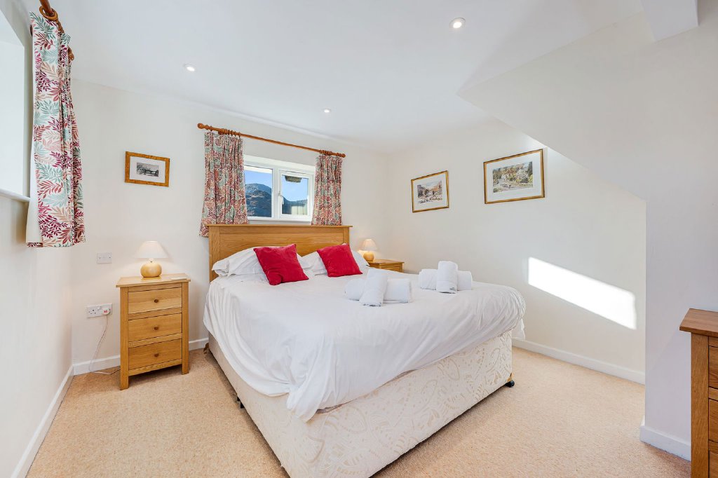 Moving through to the second hallway and staircase, there is a well presented family bathroom comprising of bath, separate walk in shower, WC, washbasin, heated towel rail, local slate tiled flooring and part tiled walls. The downstairs double bedroom is dual aspect making the room tremendously light and airy, with fabulous views to the rear.