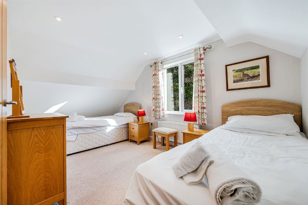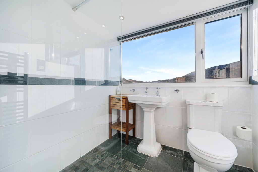 Heading up to the first floor, you have a twin bedroom with tremendous views over the surrounding landscape and convenient shelving for storage. The master bedroom is generously sized offering built in wardrobes, eaves storage and excellent views. Heading into the first landing with the oak staircase, there is loft access and a modern shower room featuring, slate tiled flooring, tiled walls, a stylish walk in shower cubicle, alongside a WC and washbasin, heated towel rail and a large picture window filling the space with natural light. The final bedroom is a bright, dual aspect room again with far reaching views towards the valley and includes built in wardrobes and a built in lockable cupboard.