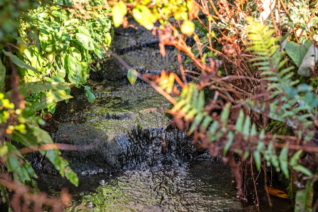 The terrace wraps around the home, offering multiple places to sit and enjoy the surroundings, steps lead up to the rear patio door, with further steps down to a convenient covered seating area. The easily maintained lawn area is perfect for relaxation, while a small bridge crosses a charming babbling brook that runs through the grounds. The lawn area includes a bench positioned to capture the elevated views surrounded by mature shrubs well-suited to the area.