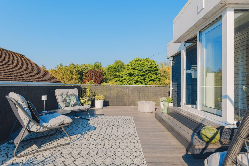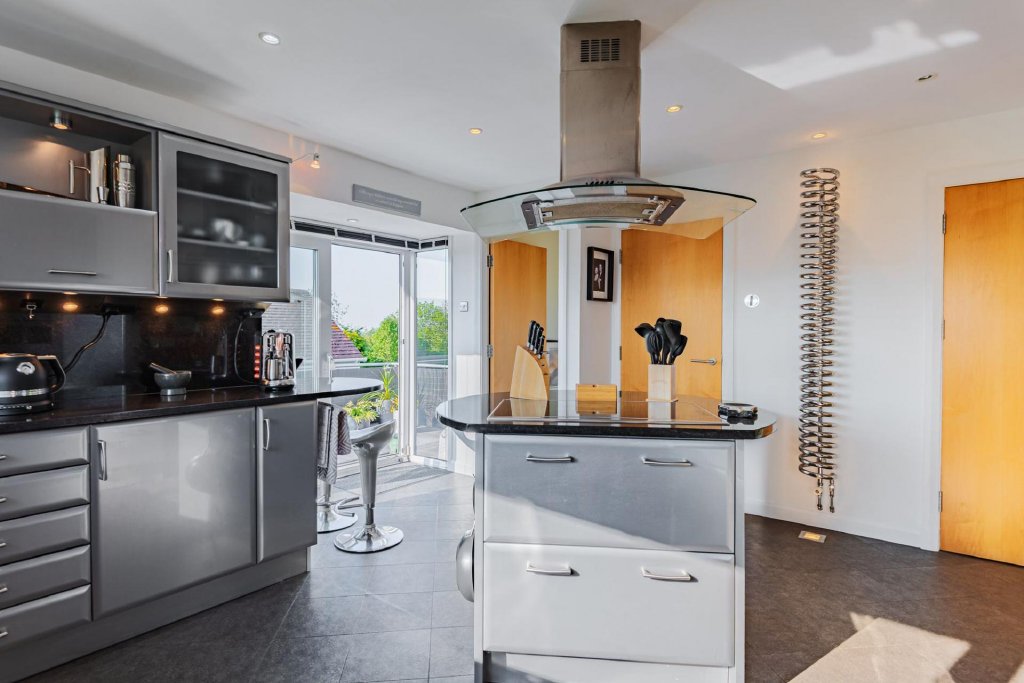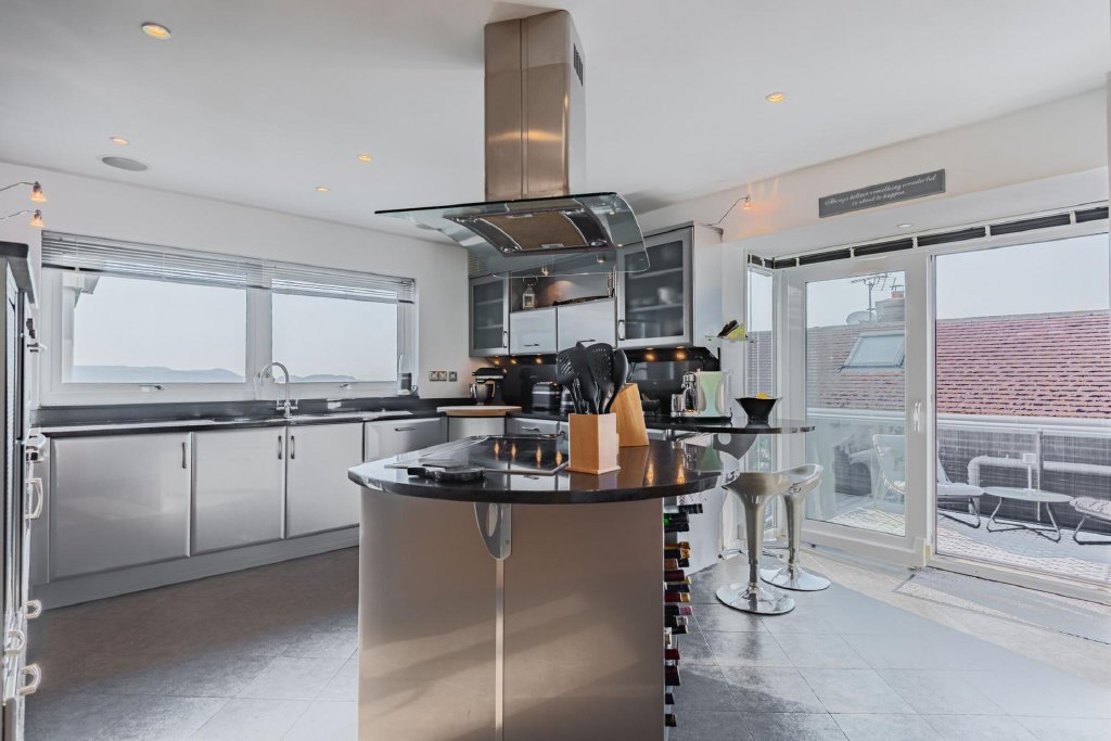 The heart of the home lies in its contemporary Italian kitchen fitted with granite worktops and NEFF appliances. A culinary haven equipped with sleek finishes and all modern conveniences. Designed for both style and functionality, it flows seamlessly into a separate utility room and the dining area, keeping daily life polished and practical. Adjacent, a large, recently updated, decked roof terrace entices you outdoors, offering the perfect setting for morning yoga, alfresco dining, summer barbecues, or quiet moments, savouring the stunning vistas that stretch before you.