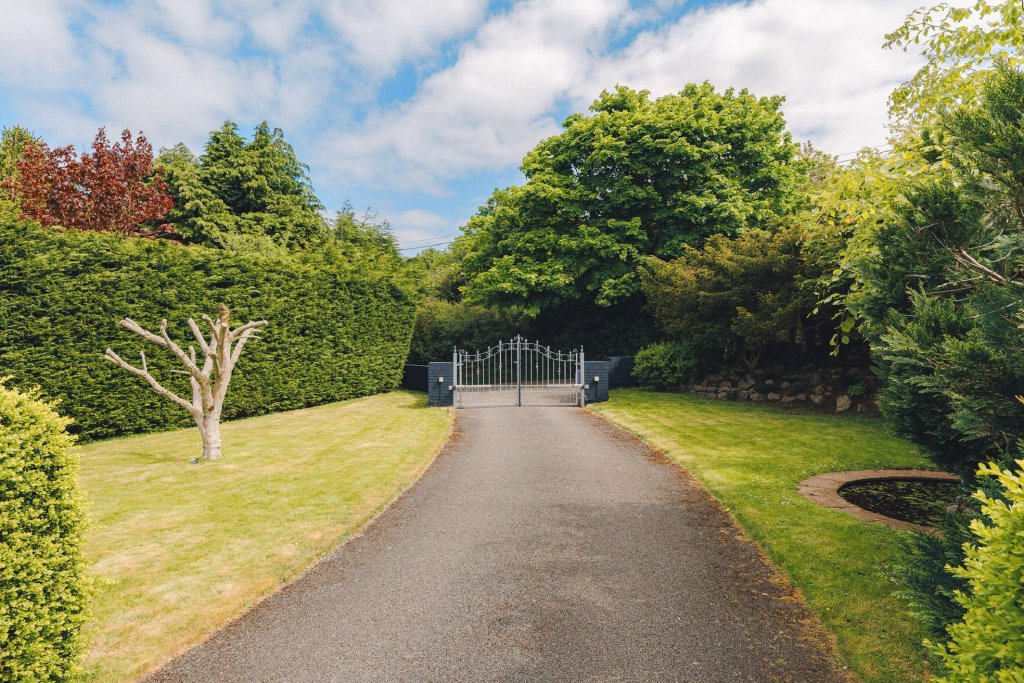 As you glide down the sweeping driveway, the home’s grandeur unfolds before you. Flanked by mature gardens bursting with vibrant hues and tranquil greenery, the property exudes an air of exclusivity and charm.