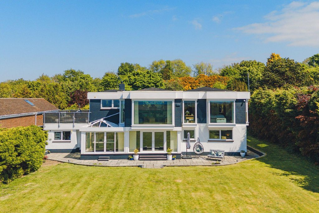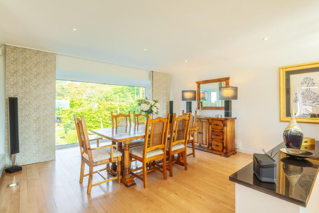 The house has multiple picture windows which maximise the views on offer and allow natural light to flood into each room. The ground floor includes an impressive leisure suite with doors opening onto the sun terrace and lawn. The open plan first floor living space is perfect for entertaining and the house is set in approximately 0.6 of an acre of gardens which include large lawns, well-stocked beds and plenty of parking as well as a garage.