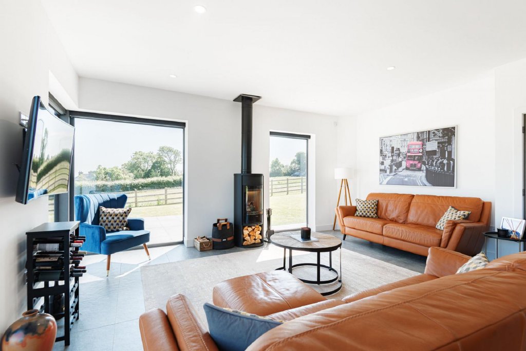The stand-out ground floor room is the Kitchen/Dining/Living Room where you can bask in the warmth of a log burner, or take in stunning views of Snowdonia, where sliding doors dissolve the boundary between indoors and out, opening onto the stunning rear terrace and gardens. The flow continues to the kitchen-Dining space, a high-specification masterpiece, boasting abundant storage, premium, Siemens, integral appliances as well as a Fisher & Paykel fridge freezer and a layout designed for both gourmet creations and intimate gatherings.