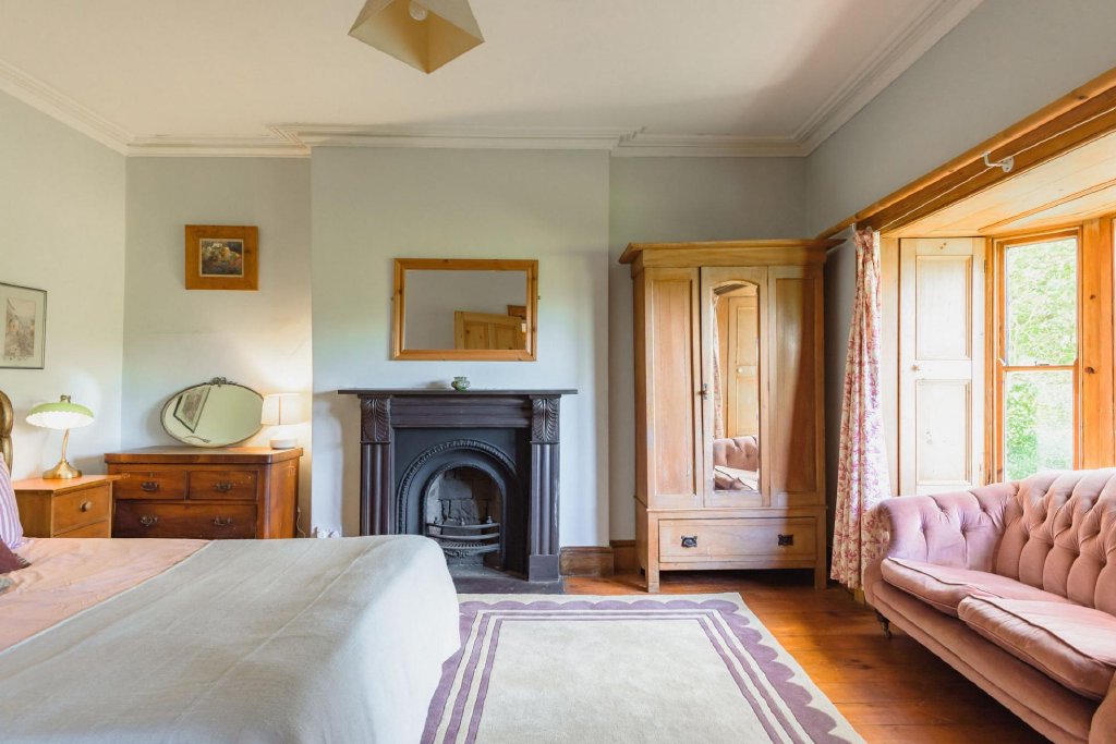 Ascend the beautifully carved wooden staircase to the main landing, where a sash window offers stunning views of the Conwy Valley. Off this light-filled space, you’ll find two principal bedrooms that continue the home’s theme of elegance and comfort. The second bedroom shares many features with the master, including a wonderful walk-in bay window with original shutters, providing a perfect spot to enjoy the stunning valley views. The master bedroom is a true sanctuary, boasting original floorboards, a feature fireplace, and a stained glass window leading to an en-suite shower room