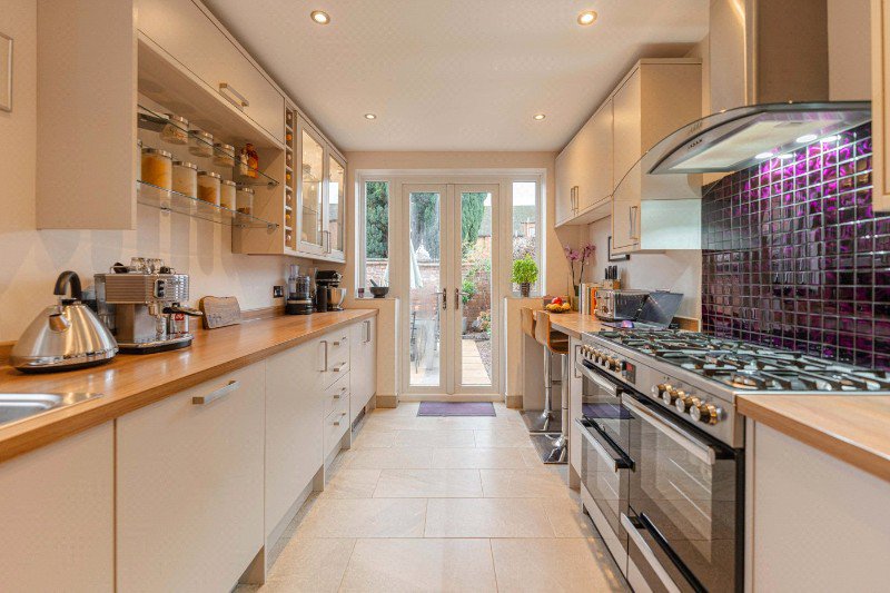 To the rear, the separate kitchen is well appointed with a contemporary range of units, ample worktop space and integrated appliances. French doors open directly onto the rear courtyard garden, creating a natural connection between indoor and outdoor living and making this an excellent space for everyday use and entertaining.