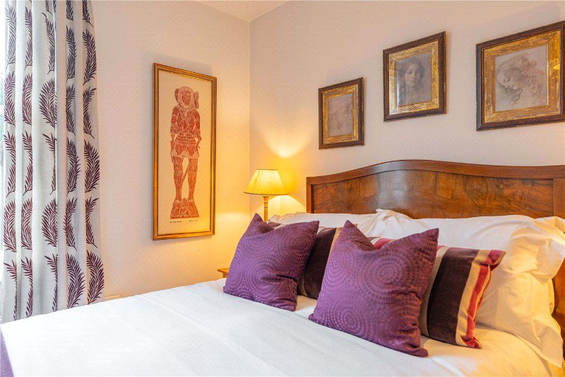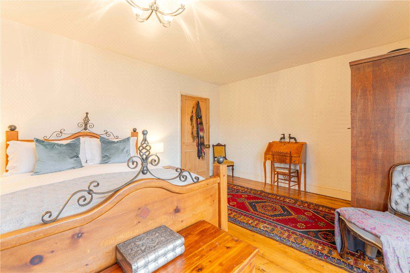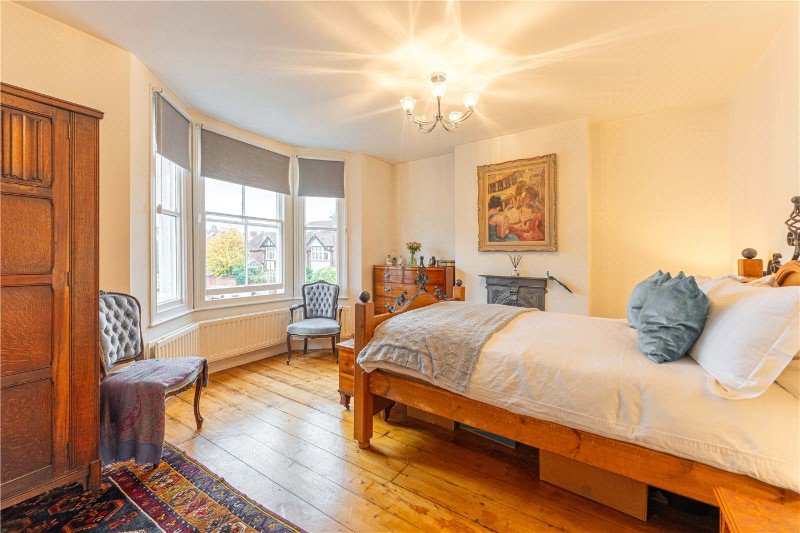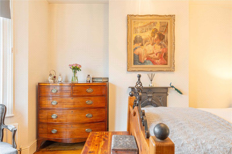 Rising to the first floor, the principal bedroom is a generous double, positioned to the front of the house and enjoying large sash windows and ample space for freestanding furniture. Two further bedrooms are located on this level, both well proportioned and suitable for family use, guests or home working.