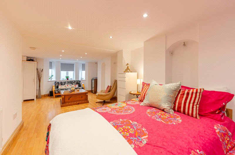The fully tanked and building-regulation-approved cellar has been converted to create an impressive open-plan bedroom and study area. This versatile space is ideal as a guest suite, home office, studio or additional living accommodation, offering excellent ceiling height and a calm, practical layout.