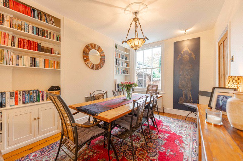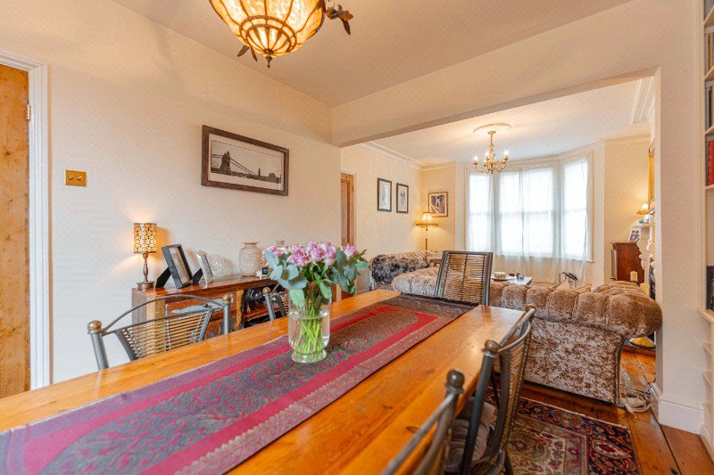 To the front of the house sits an elegant sitting room, flooded with natural light through a large bay window and centred around a feature fireplace, creating a warm and inviting reception space. This open plan space flows seamlessly into a second reception room, currently arranged as a formal dining room, ideal for entertaining and family life, with views towards the rear of the house.