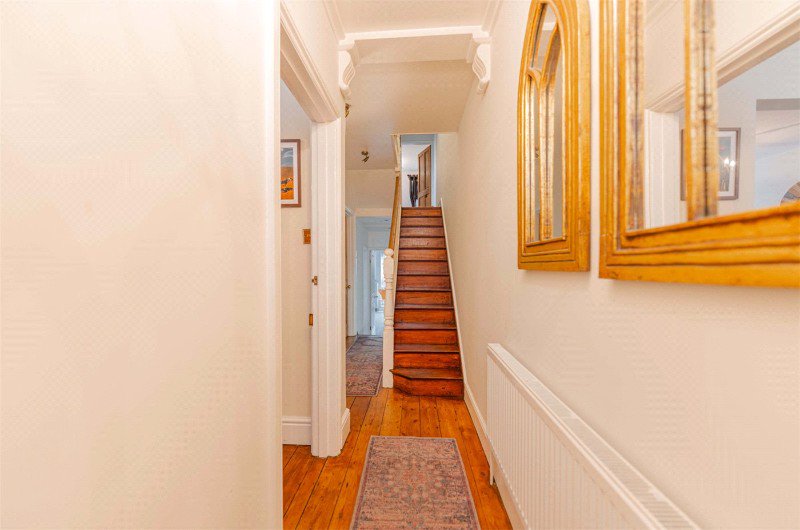 The property is approached via a wrought iron frontage and opens into a welcoming entrance hall, which immediately sets the tone with original detailing and a sense of scale typical of houses of this era.